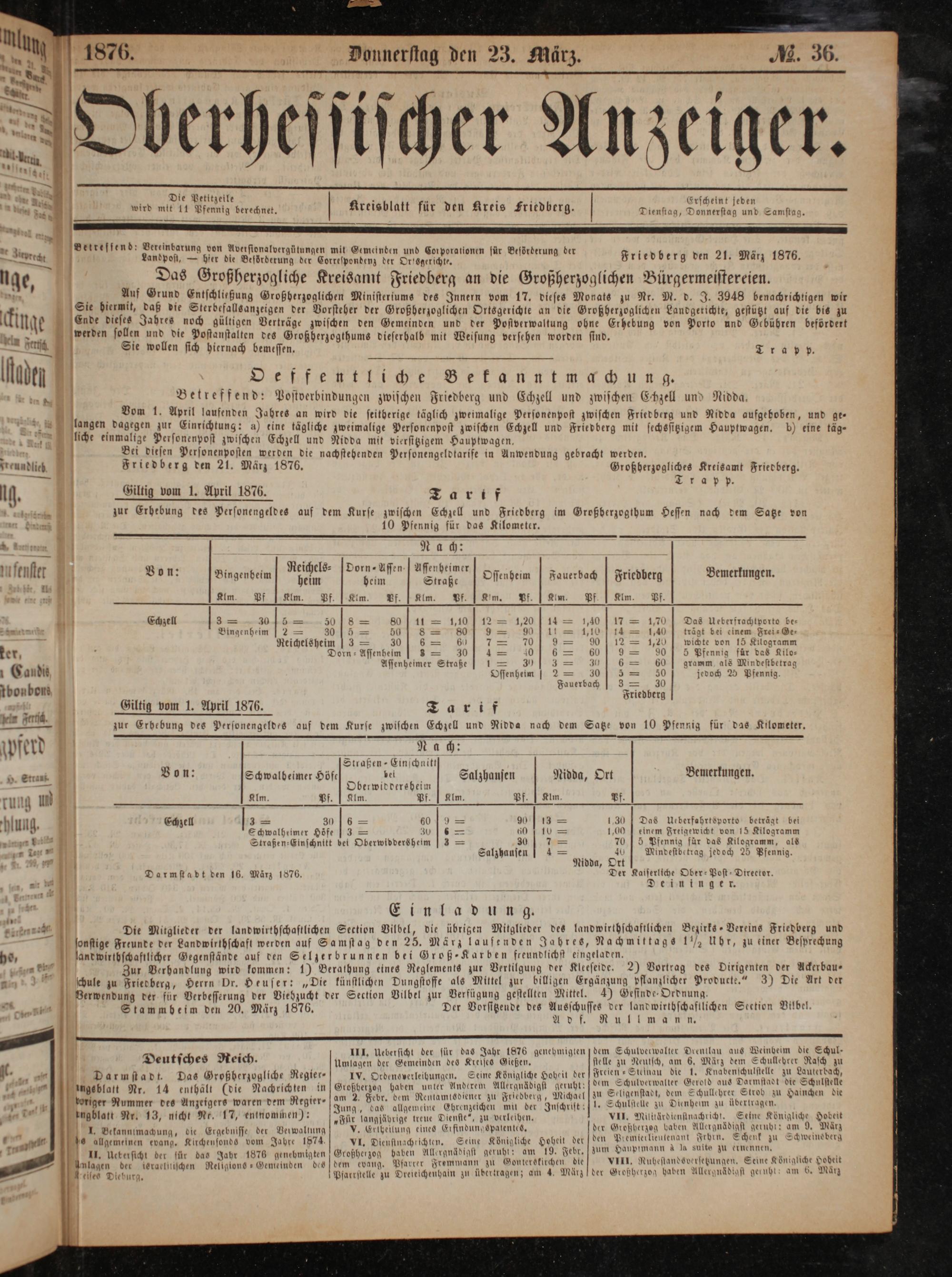 .— von 10 Pfennig für das Kilometer. „rord 2— fete i 3 Na sch: b 5 Straßen-Einschnitt ö b. en Von: Schwalbeimer Höfe bei f Salzhausen Nidda, Ort Bemerkungen. 2 Oberwiddersheim rung uw Alm. Vf. Lm Pf.] Alm. Pf. Kin. vf. lung. 1 Echzell*——— 60 19 2 90 13 2 130] Das Ueberfahrtsporto beträgt bei 1 95 Schwalheimer Höfe 3= 30 6 60 10 2 1,00] einem Freigewicht von 15 Kilogramm , Straßen⸗Einschnitt bei Oberwiddersheim 3= 30 9— 70 5 Pfennig für das Kilogramm, als * D Salzhausen—— 40 Mindestbetrag jedoch 25 Pfennig. 1 Nidda, Ort 11 Darmstadt den 16. März 1876. Der Kaiserliche Ober-Post-Direetor. a n Lee Deininger. 1 Einladung. * Grag. Die Mitglieder der landwirthschaftlichen Section Vilbel, die übrigen Mitglieder des landwirthschaftlichen Bezirks-Vereins Friedberg und
