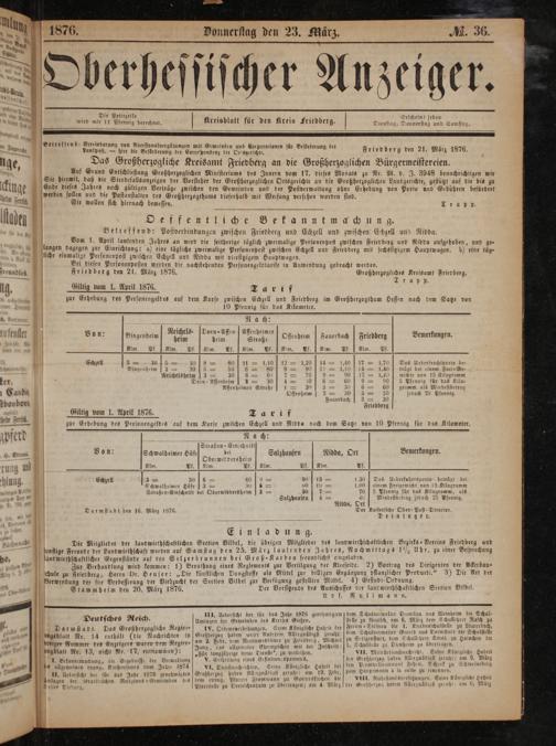 Oeffentliche Bekanntmachung. Betreffend: Postverbindungen zwischen Friedberg und Echzell und zwischen Echzell und Nidda Vom 1. April laufenden Jahres an wird die seitberige täglich zweimalige Personenpost zwischen Friedberg und Nidda aufgeboben, und ge— langen dagegen zur Einrichtung: a) eine tägliche zweimalige Personenpost zwischen Echzell und Friedberg mit sechssitzigem Hauptwagen. b) eine täg- liche einmalige Personenpost zwischen Echzell und Nidda mit viersitzigem Hauptwagen. Bei diesen Personenposten werden die nachstehenden Personengeldtarife in Anwendung gebracht werden. Friedberg den 21. März 1876. Großberzogliches Kreisamt Friedberg.