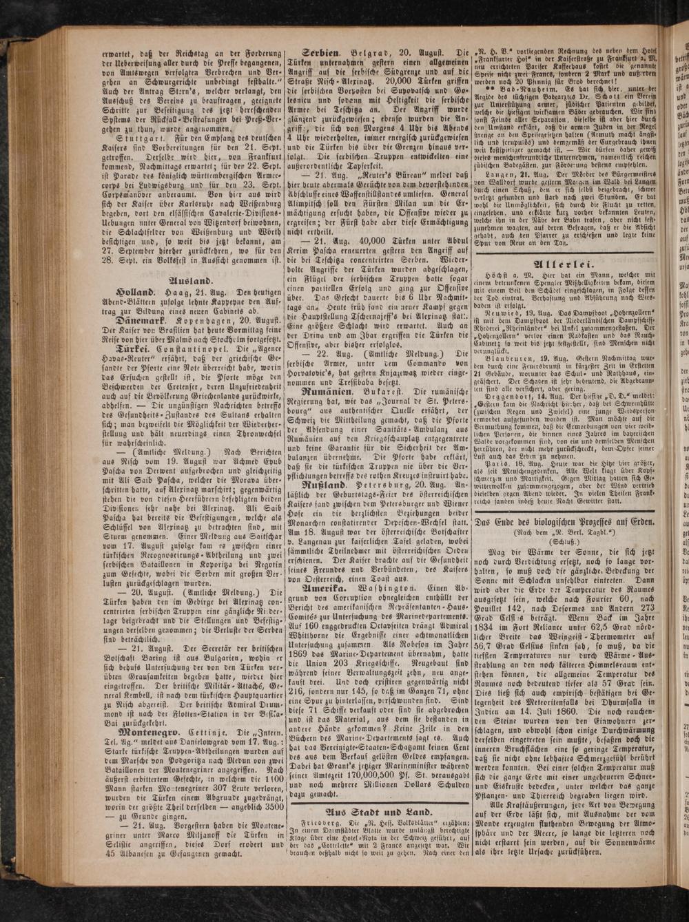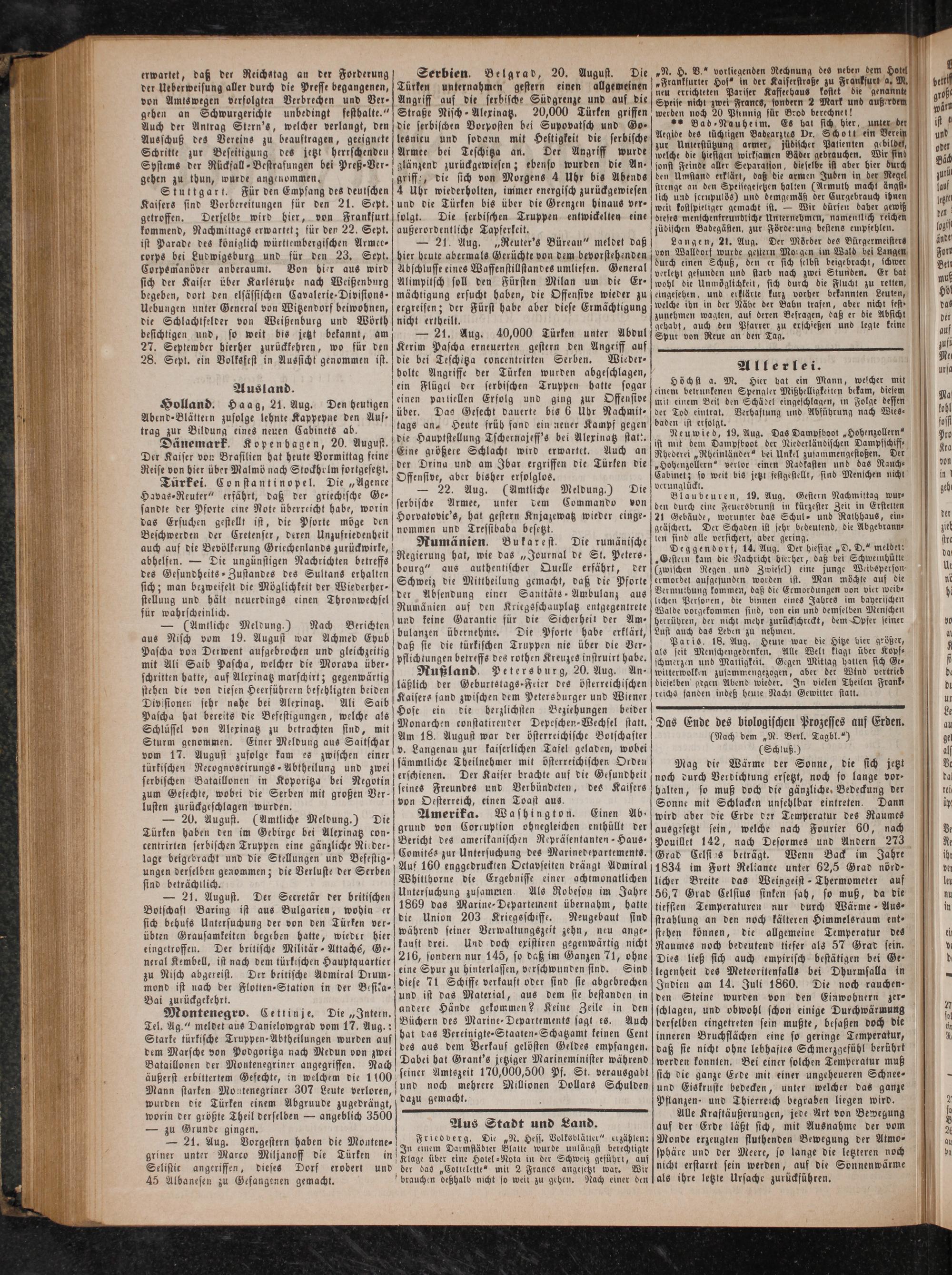 — 20. August.(Amtliche Meldung.) Die Türken haben den im Gebirge bei Alexinatz con- centrirten serbischen Truppen eine gänzliche Nilder⸗ lage beigebracht und die Stellungen und Befestig— ungen derselben genommen; die Verluste der Serben sind beträchtlich.