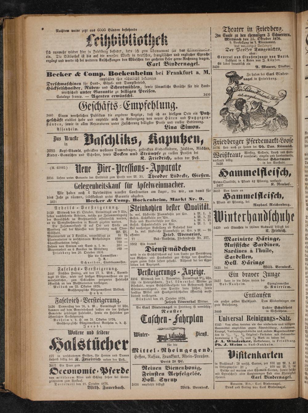 0 14 Wilh Fauerbach empfiehlt billigst 10 Verantw. Red.: Carl Bindernagel. l 12.„ Wilh. Bernbeck. Druck und Verlag von Carl Bindernagel.