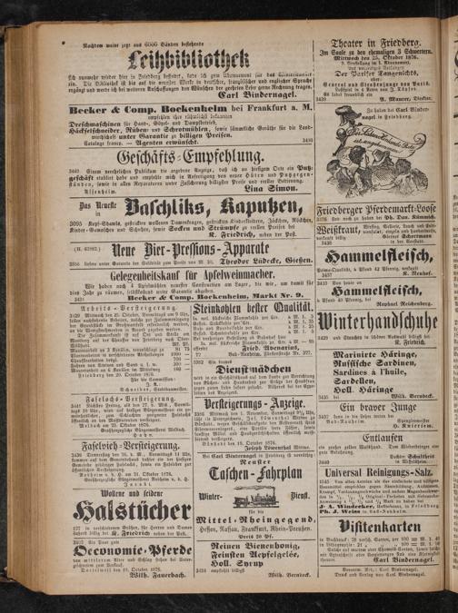 i Chaufftrarbeiten desgl. 8 eee eee ee. Marinirte Häringe, 8 i Fahren von Steinen und Sand u. s. w. 300— in brave 9 2— un 1 Maurerarbeit an 6 Kanälen im Mittelweg 160— Dienst mädchen Russische Sardinen, ei „„ Friedberg den 20. Oetober 1876.„ 1 i Sardines a Thuile a ö 0 ö Für die Commission: wird in ein Geschäftshaus auf dem Lande zur Verrichtung 7 det J. A.: von Küchen⸗ und Hausarbeit zur Stütze der Hausfrau Sardellen, fal 0 Schneider, Stadtbaumeister. gegen guten Lohn sofort gesucht. Näheres bei der Expe⸗— 3 M 1 5 dition des Anzeigers. Holl. Häringe die 1 5 C 15 3435 bei Wilh. Bernbeck. e 117 0 441 Nächsten Freitag, als den 27. d. Mts., Vormit⸗ 15 st— A 3 5 i 10 tags 10 Uhr, wird auf hiesiger Bürgermeisterei ein ge: Kl kigerungs 0 kigk. Ein braver Junge gi 1 6 meinheitlicher, zum Schlachten geeigneter Faselochs 3386 Mittwoch den 1. November, Vormittags 9½ Uhr, ne 400 öffentlich an den Meistbietenden versteigert. läßt vie Unterzeichnete, Jo. Löwenthal Wittwe zu 3432 kann in die Lehre treten bei 9 1 Melbach am 23. Oktober 1876. Bönstadt, wegen Geschäftsaufgabe den Restvorrath ihres Bad⸗ Nauheim. Spenglermeister 0 Großherzogliche Bürgermeisterei Melbach.] Eisenwaarenlagers, eine Parthie leere Fässer, sowie l H. Knieriem. 1 Hahn. sonstige Möbel und Hausgeräthschaften öffentlich meist⸗ 1 1 5 5 bietend versteigern. 3 1 Faselvieh ⸗Versteigerung Bönstadt den 19. October 1876. Entlaufen 0 10 8 1 Joseph Löwenthal Wittwe. ein großer gelber Wofshund. Dem Wiederbringer eine 17 1. 3436 Donnerstag den 26. d. M., Vormittags 11 Uhr, Bei Carl Bi 11 a 7 7 gute Belohnung. f „ kommen auf dem Gemeindehaus dahier ein der hiesigen el Carl Bindernagel in Friedberg ist vorrätig; Pachter Schultheis le 1 Gemeinde gehöriger Faselochs, sowie ein Faseleber zur Neuster 3440 in Wisselsheim.“ be . öffentlichen Versteigerung. f 91