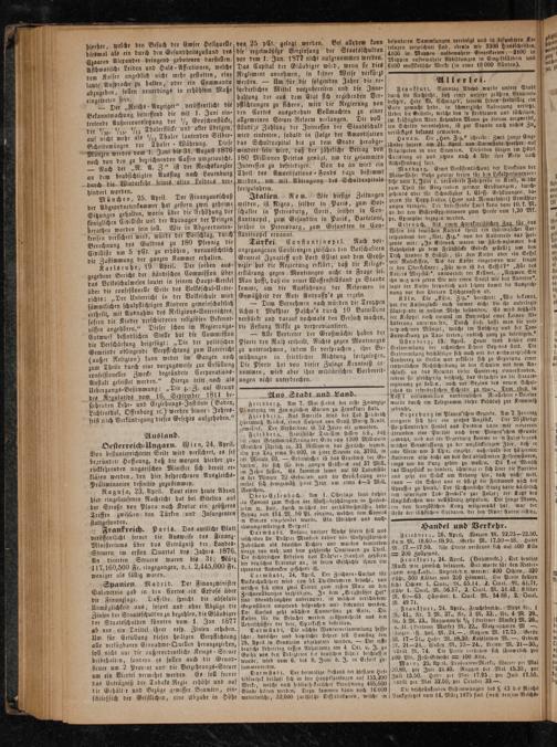 Frankfurt, 24. April.(Viehmarkt.) Der heutige Markt war ziemlich befahren. Viel wurde für den Niedere rbein angekauft. Angetrieben waren: 400 Ochsen, 320 Kühe, 300 Kälber und 250 Hämmel. Die Preise stellten sich: Ochsen 1. Qual. M. 65,14, 2. Qual. M. 60.71, Kühe 1. Qual. M. 56.57, 2. Qual. M. 51.43, Kälber M. 60-63, Hämmel 1. Qual. M. 5486, 2. Qual. M. 49.71.