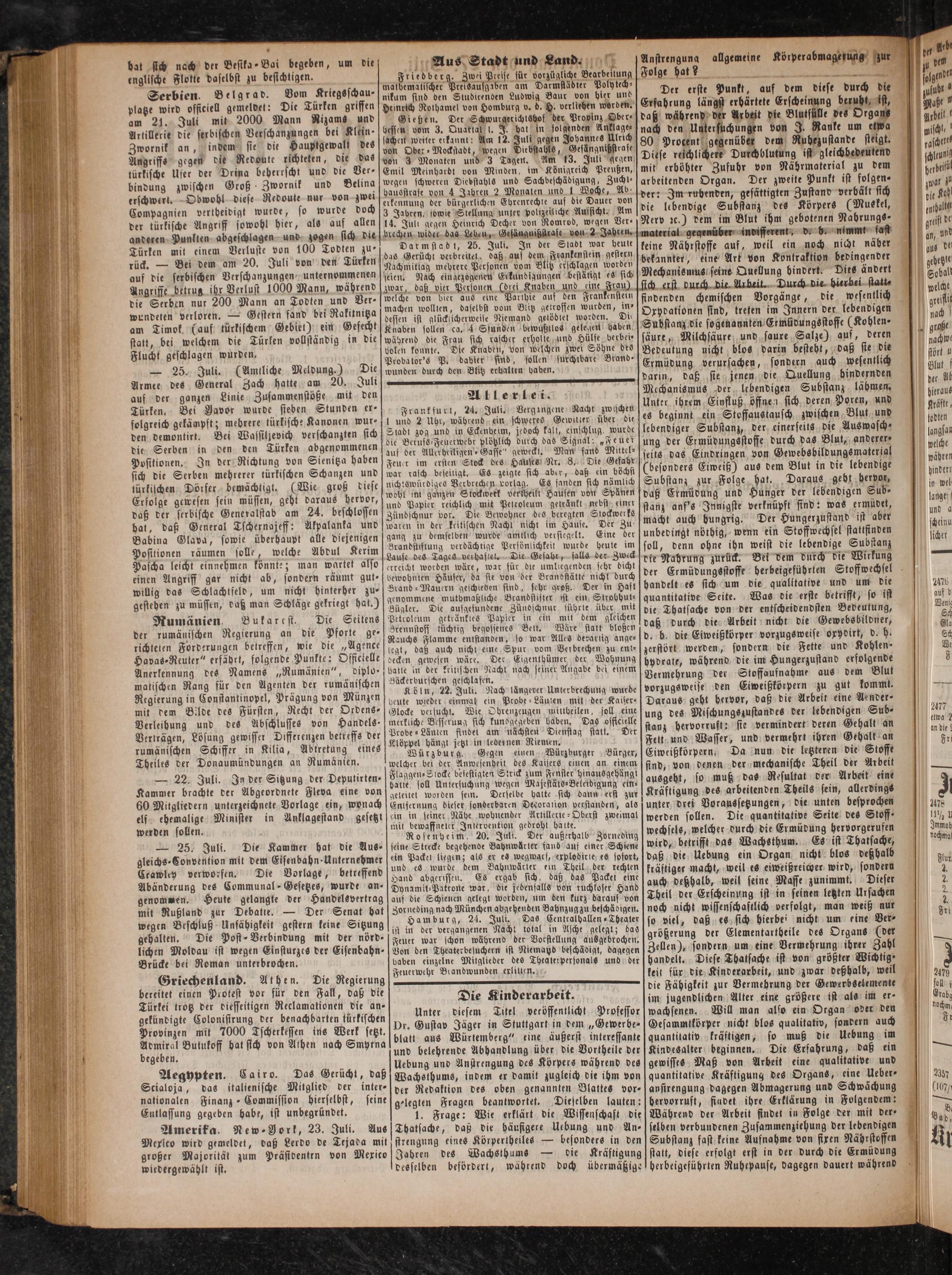 Serbien. Belgrad. Vom Kriegsschau⸗ platze wird offieiell gemeldet: Die Türken griffen am 21. Juli mit 2000 Mann Nizams und Artillerie die serbischen Verschanzungen bei Kltin⸗ Zwornik an, indem sie die Hauptgewalt des Angriffs gegen die Redoute richteten, die das türkische Ufer der Drina beherrscht und die Ver⸗ bindung zwischen Groß Zwornik und Belina erschwert. Obwohl diese Redoute nur von zwei Compagnien vertheidigt wurde, so wurde doch der türkische Angriff sowohl hier, als auf allen anderen Punkten abgeschlagen und zogen sich die Türken mit einem Verluste von 100 Todten zu⸗ rück.— Bei dem am 20. Juli von den Türken auf die serbischen Verschanzungen, unternommenen Angriffe betrug ihr Verlust 1000 Mann, während die Serben nur 200 Mann an Todten und Ver- wundeten verloren.— Gestern fand bei Rakitnitza am Timok(auf türkischem Gebiet) ein Gefecht statt, bei welchem die Türken vollständig in die Flucht geschlagen wurden,