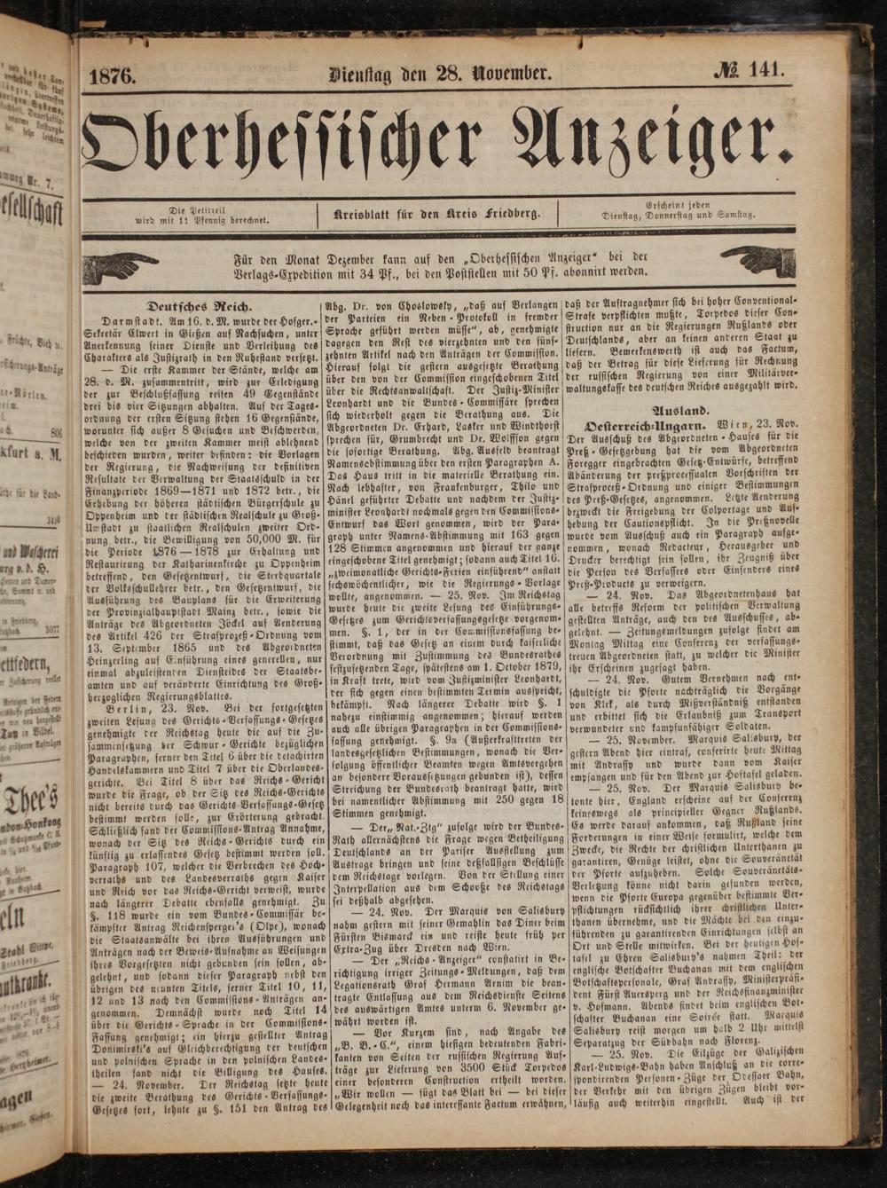 Für den Monat Dezember kann auf den„Oberhessischen Anzeiger“ bei der Verlags-Expedition mit 34 Pf., bei den Poststellen mit 50 Pf. abonnirt werden.
