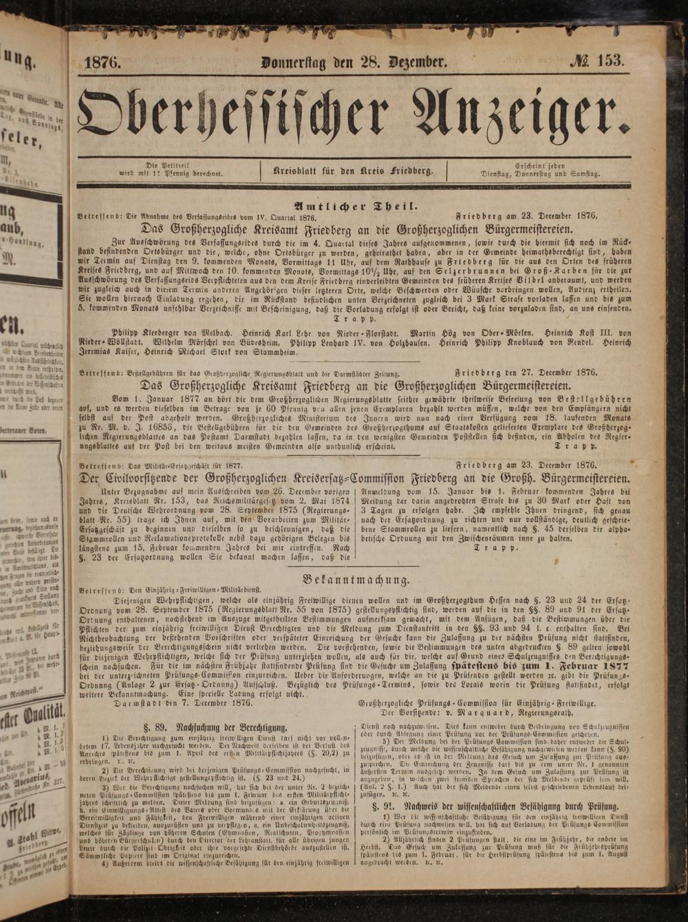 Betressend: Die Abnahme des Verfassungseides vom IV. Quartal 1876. Friedberg am 23. December 1876.