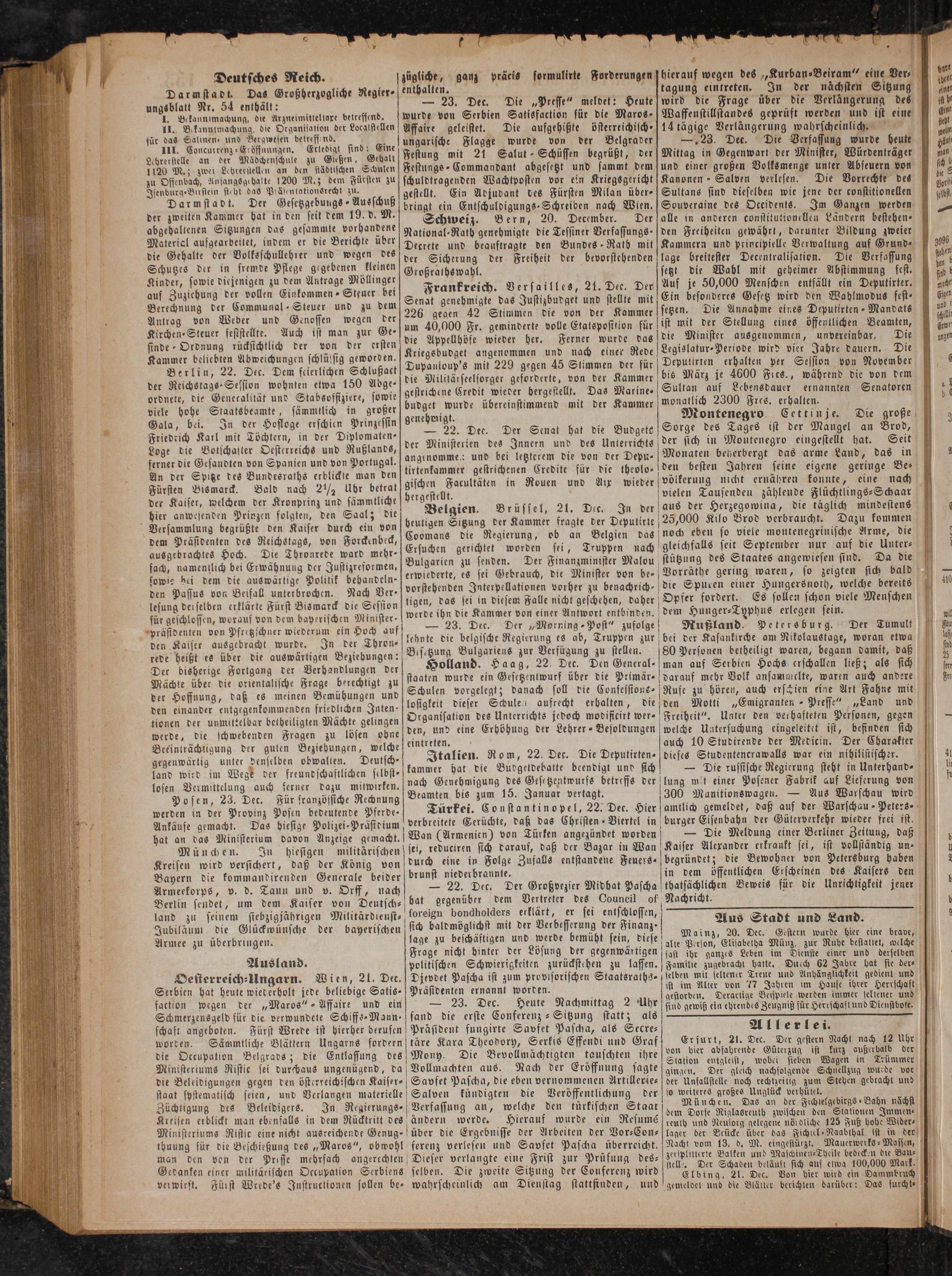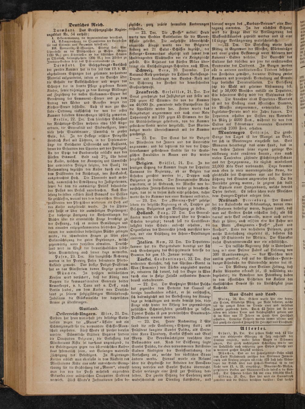 Fürsten Bismarck. Bald nach 2½ Ubr betrat gischen Facultäten in Rouen und Aix wieder der Kaiser, welchem der Kronprinz und sämmtliche e e Brüssel, 21. De 5 hier anwesenden Prinzen folgten, den Saal; die Belgien. rüssel, 21. Dic. In der heutigen Sitzung der Kammer fragte der Deputirte 5; die Regierung, ob an Belgien das dem Präsidenten des Reichstags, von Forckenbeck, Coomans die 9. a ausgebrachtes Hoch. Die Thronrede ward mehr- Ersuchen gerichtet worden sti, Truppen nach sach, namentlich bei Erwähnung der Justizreformen, Bulgarien zu senden. Der Finan minister Malou sowie bei dem die auswärtige Politik bebandeln— erwiederte, es sei Gebrauch, die Minister von be⸗ den Passus von Beifall unterbrochen. Nach Ver' vorstehenden Interpellationen vorher zu benachrich⸗ lesung derselben erklärte Fürst Bismarck die Session gen, das sei in diesem Falle 43 550 geschehen, daher für geschlossen, worauf von dem bayerischen Minister. werde ihn die Kammer von einer Antwort e prästdenten von Pfretzschner wiederum ein Hoch auf, 7 5 23. Der. 10„Morring Post zufolge den Kaiser ausgebracht wurde. In der Thron⸗ lehnte die belgische Regierung es ab, Truppen zur rede heißt es über die auswärtigen Beziebungen: Besczung 11 zur e zu stellen. Der bisherige Fortgang der Verhandlungen der Hollan. Dec. Den 5 Mächte über die orientalische Frage berechtigt zu staaten wurde ein Gesetzentwurf über die Primär- der Hoffnung, daß es meinen Bemühungen und Schulen vorgelegt; danach soll die Confesstone den einander entgegenkommenden friedlichen Inten— losigkeit dieser Schule aufrecht erbalten, 45 tionen der unmittelbar betheiligten Mächte gelingen Organisation des Unterrichts 1 modificirt A werde, die schwebenden Fragen zu lösen ohne den, und eine Erhöhung der Lehrer-Besoldungen 2 8 750 5 intreten. Beeinträchtigung der guten Beziehungen, welche einten. 1. 5 gegenwärtig unter denselben obwalten. Deutsch⸗ Italien. 1 22. Dec. Die Deputirten⸗ land wird im Wege der freundschaftlichen selbst⸗ kammer hat die Budgetdebatte beendigt und sich losen Vermittelung auch ferner dazu mitwirken. nach Genehmigung des Gesetzentwurfs betreffs der Posen, 23. Dec. Für französsiche Rechnung Beamten bis zum 15. Januar vertagt. i werden in der Provinz Posen bedeutende Pferde- Türkei. Constantinopel, 22. Dec. Hier Ankäufe gemacht. Das hiesige Polizei-Praͤsidium verbreitete Gerüchte, daß das Christen Viertel in hat an das Ministerium davon Anzeige gemacht. Wan(Armenien) von Türken angezündet worden München. In hiesigen