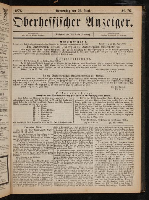 IV., V. und VI. Bekanntmachungen, die Erhebung einer nachträglichen Umlage der israelitischen Religions- gemeinde Angenrod für 1876, die Nichterhebung der Um⸗ lagen der israelitischen Religionsgemeinde zu Ober⸗Ramstadt für 1875, und die für das Jahr 1876 in der Gemeinde Frei⸗Laubersheim zu erhebenden Umlagen betreffend.