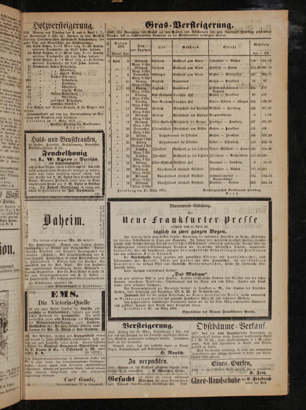 —d——— S Date Abthellun 8 1876 Ta t asth aus tra* 8— und Tageszeit 58 dig 9— 0 Monat] Tag von bis 1 April 5] Mittwoch Lindheim Gasthaus zum Stern Ilbenstadt— Büches 204 285, 16 Morg. 9 Uhr 2 5 Weng 5 Lindheim Gasthaus zum Stern[Hersfeld— Hanau 328, 29385, 70 org. r 5 6 Donnerstag[Büdingen Gasthaus zum Stern[Gießen— Gelnhausen 225 233,75 Morg. 9 Uhr ö 3 10 Montag Butzbach Gambrinus Gießen— Frankfurt 716 4 90 * Morg. 10 Uhr 0 11 hirn 4 4 0 10] Montag Butzbach[Gambrinus Hessenbrückerhammer— 233 276 Morg. 10 Uhr Butzbach „ 1 Diensag Bad Nauheim Deutscher Hof Gießen— Frankfurt 90 129 Morg. 9 Uhr a — 11 8 Bad⸗RauheimDeutscher Hof Nieder-⸗Mörlen Usingen 104 138,38 „ u Mittwoch Welbas Gnthschaft von Philtppiserstadt— Friedberg 122 167,50 Morg. 9 Uhr 5 12] Mittwoch[Melbach Wirthschaft von Philippi[Bergwerksstraße 0 5,06 Morg. 9 Uhr 6 0 19] Mittwoch[Ober⸗ResbachWirthschaft bei Ruppel[Friedberg— Homburg 137 168,80 Morg. 9 Uhr ö 7 5 20 Donnerstag[Oberwöͤllstadt Wirthschaft von Müller[Gießen— Frankfurt 136 166 Morg. 9 Uhr e Freitag Selzerbrunnen bei Okarben Gießen— Frankfurt 166 222, 33 Mittags 2 Uhr n Freitag Selzerbrunnen bei Okarben Vilbel— Offenbach 219 222, 70 Mittags 2 Uhr 9 A Samstag Ilbenstadt Gasthaus zu den 3 Hasen[Nieder⸗Woöͤllstadt— Hanauftö! 206, 48 Morg. 9 Uhr n Samstag IIlbenstadt Gasthaus zu den 3 HasensIlbenstadt— Reichelsheim 167, 680190 Morg. 9 Uhr . 24] Montag[Ober⸗Eschbach[Brüsseler Hof Bonames— Homburg 0 10, 45 Morg. 10 Uhr 11„ 26] Mittwoch Chausseehaus oberhalb Bönstadt Ilbenstadt— Büches 175, 160204 Morg. 10 Uhr „ 26] Mittwoch Chausseehaus oberhalb Bönstadt[Schwalheimerhof— 162 183,52 Morg. 0 Uhr Nonnenstümpf 5 26] Mittwoch Chausseehaus oberhalb Bönstadt[Ranstadt— Staden 206 214,54 Morg. 10 Uhr