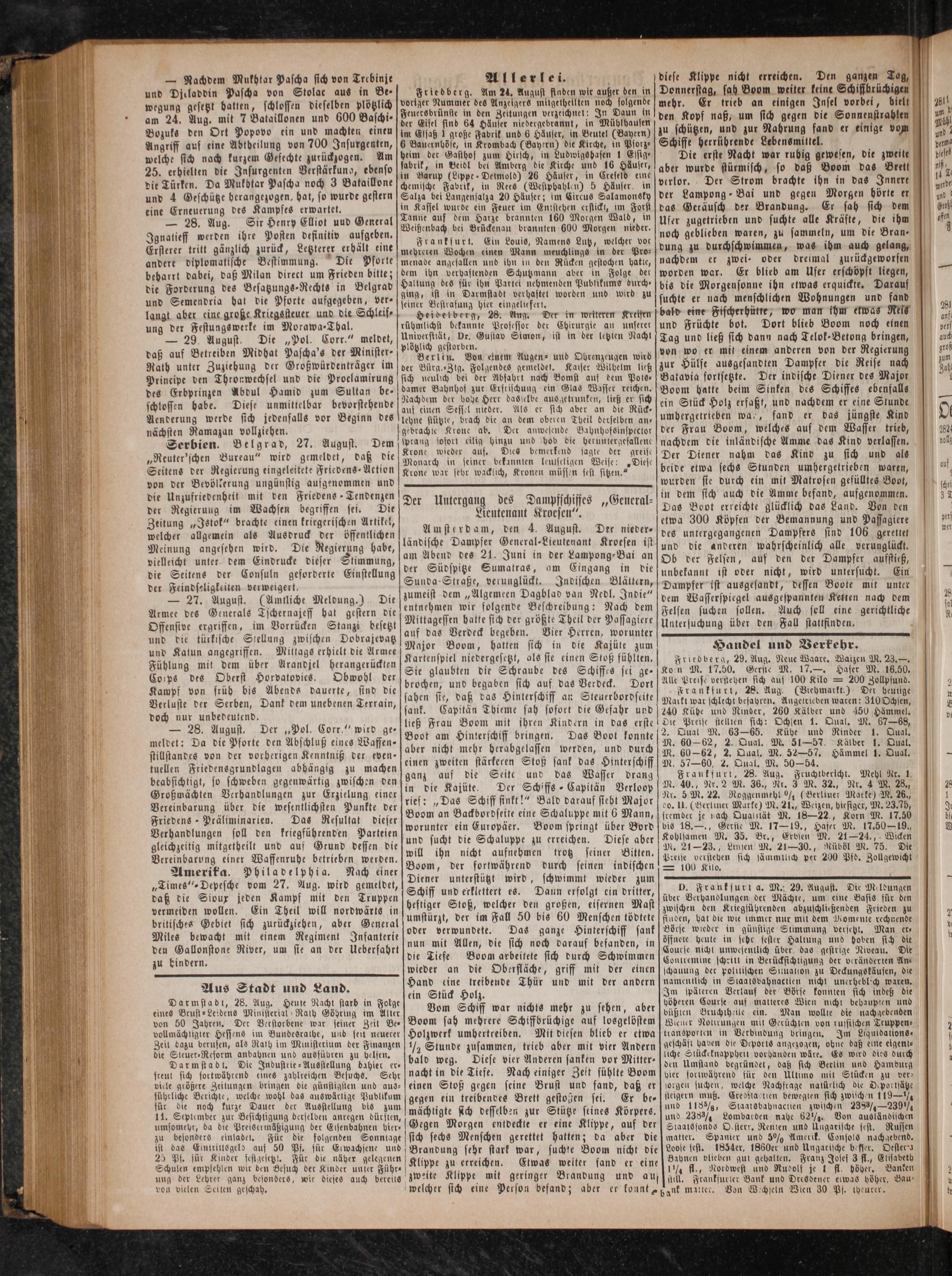 Die erste Nacht war ruhig gewesen, die zweite aber wurde stürmisch, so daß Boom das Brett verlor. Der Strom brachte ihn in das Innere der Lampong Bai und gegen Morgen hörte er das Geräusch der Brandung. Er sah sich dem Ufer zugetrieben und suchte alle Kräfte, die ihm noch geblieben waren, zu sammeln, um die Bran- dung zu durchschwimmen, was ihm auch gelang, nachdem er zwei- oder dreimal zurückgeworfen worden war. Er blieb am Ufer erschöpft liegen, bis die Morgensonne ihn etwas erquickte. Darauf suchte er nach menschlichen Wohnungen und fand bald eine Fischerhütte, wo man ihm etwas Reis und Früchte bot. Dort blieb Boom noch einen Tag und ließ sich dann nach Telok-Betong bringen, von wo er mit einem anderen von der Regierung zur Hülfe ausgesandten Dampfer die Reise nach Batavia fortsetzte. Der indische Diener des Major Boom hatte beim Sinken des Schiffes ebenfalls ein Stück Holz erfaßt, und nachdem er eine Stunde umhergetrieben wan, fand er das jüngste Kind der Frau Boom, welches auf dem Wasser trieb, nachdem die inländische Amme das Kind verlassen. Der Diener nahm das Kind zu sich und als beide etwa sechs Stunden umhergetrieben waren, wurden sie durch ein mit Matrosen gefülltes Boot, in dem sich auch die Amme befand, aufgenommen. Das Boot erreichte glücklich das Land. Von den etwa 300 Köpfen der Bemannung und Passagiere des untergegangenen Dampfers sind 106 gerettet und die anderen wahrscheinlich alle verunglückt. Ob der Felsen, auf den der Dampfer aufstieß, unbekannt ist oder nicht, wird untersucht. Ein Dampfer ist ausgesandt, dessen Boote mit unter dem Wasserspiegel ausgespannten Ketten nach dem Felsen suchen sollen. Auch sell eine gerichtliche Untersuchung über den Fall stattfinden,