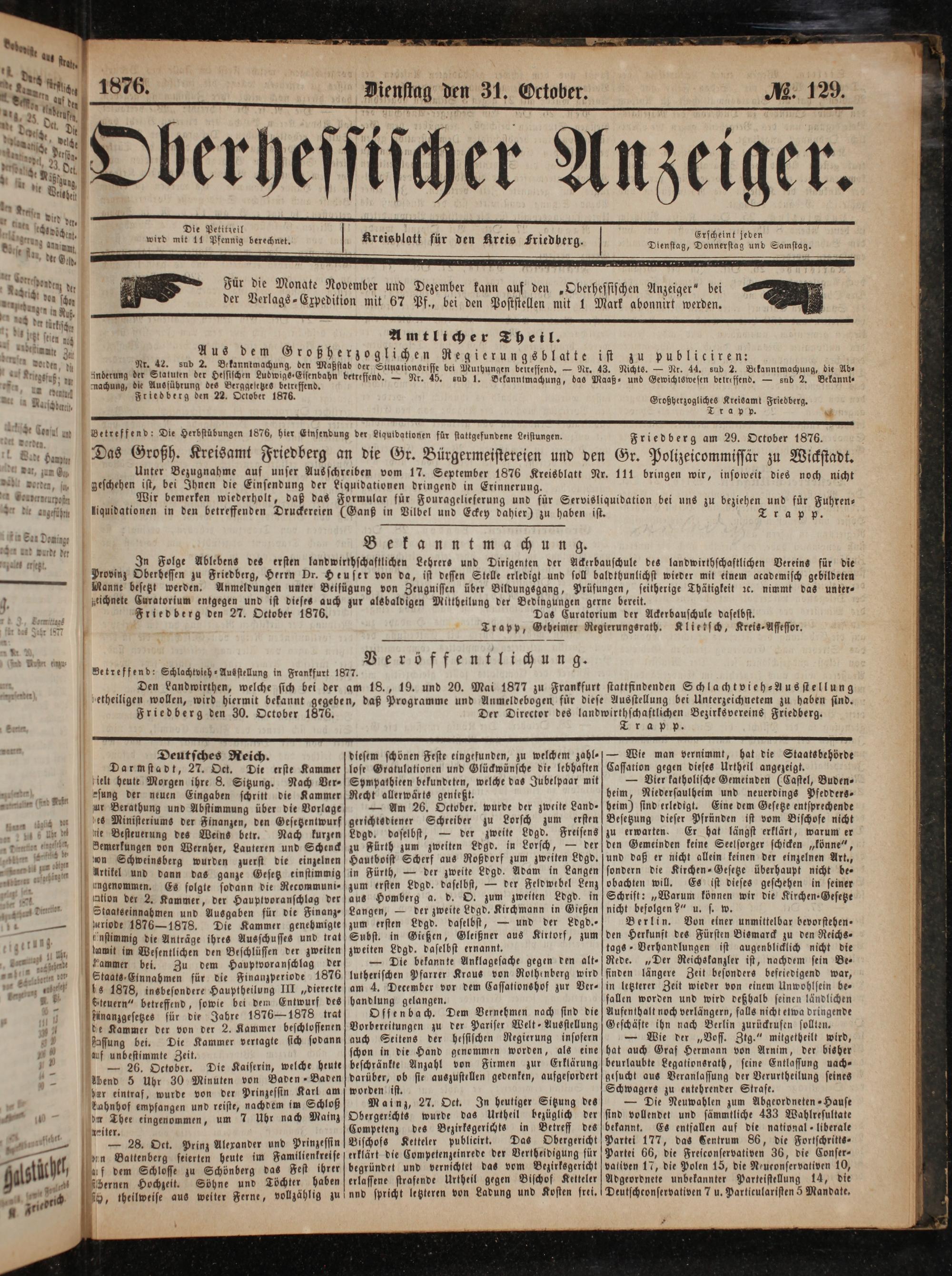 Für die Monate November und Dezember kann auf den„Oberhessischen Anzeiger“ bei der Verlags-Expedition mit 67 Pf., bei den Poststellen mit 1 Mark abonnirt werden.
