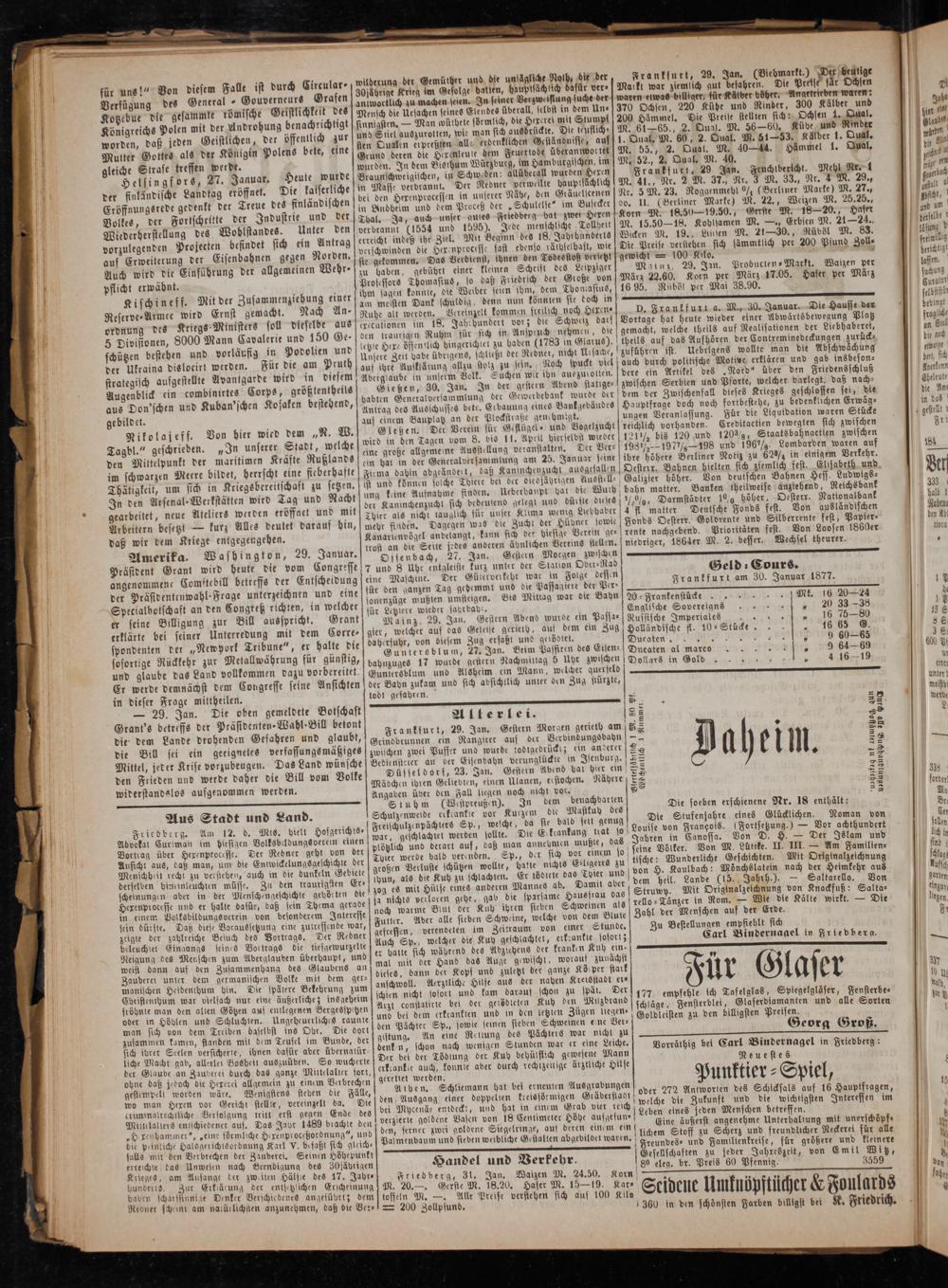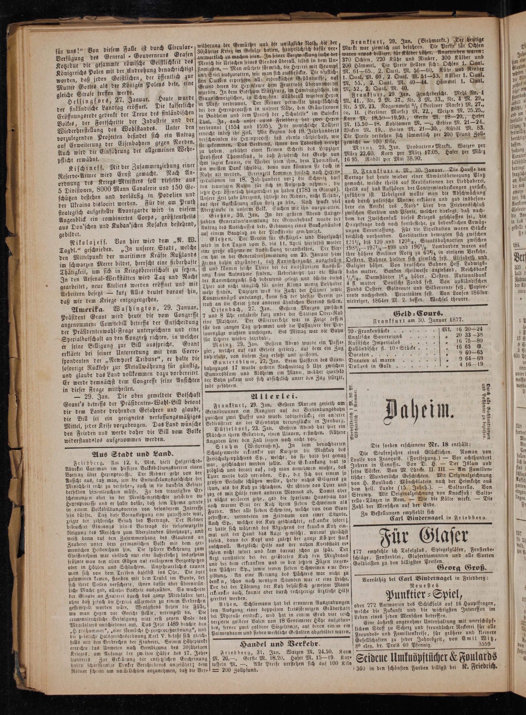 Frankfurt am 30. Januar 1877. 20⸗Frankenstücke„ b Mt. 162024 Englische Sovereigns 0„ 20 33 38 Russische Imperiales 5„ 16 75—80 Holländische fl. 10⸗Stücke. i Duücafent, sen z ücen 9 60—65 Ducaten al marco„ 9 6469 Dollars in Gold* 4 1619