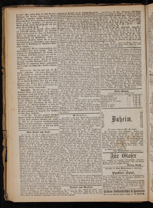 Frankfurt, 29. Jan. Gestern Morgen gerieth am Grindbrunnen ein Rangiter auf der Verbindungsbahn zwischen zwei Puffer und wurde todigedrückt; ein anderer Bediensteter an der Eisendahn verunglückte in Isenburg.