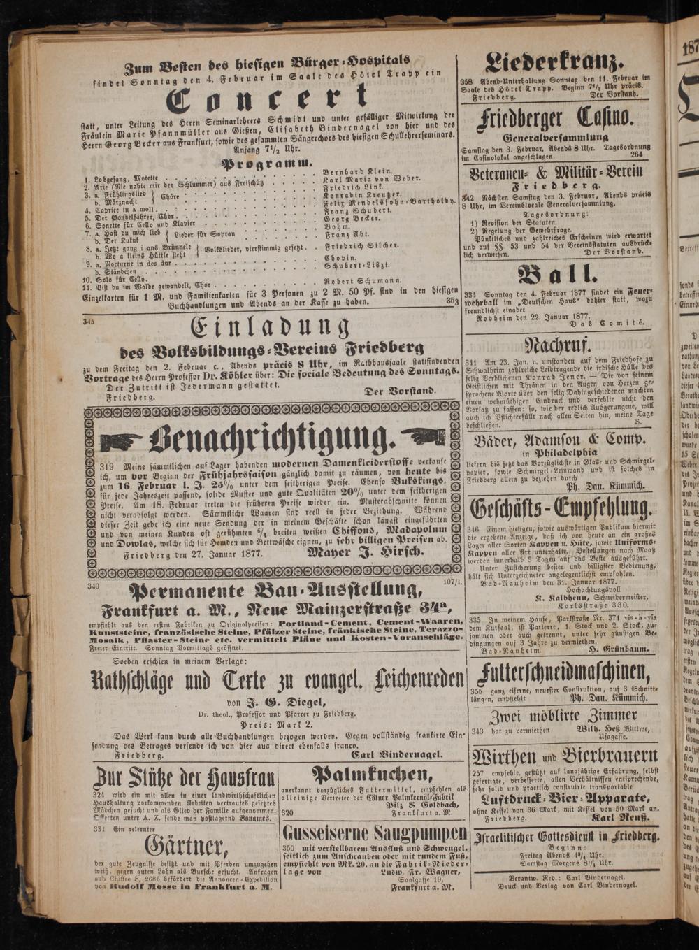 Der Zutritt ist Jedermann gestattet. Friedberg. Der Vorstand.