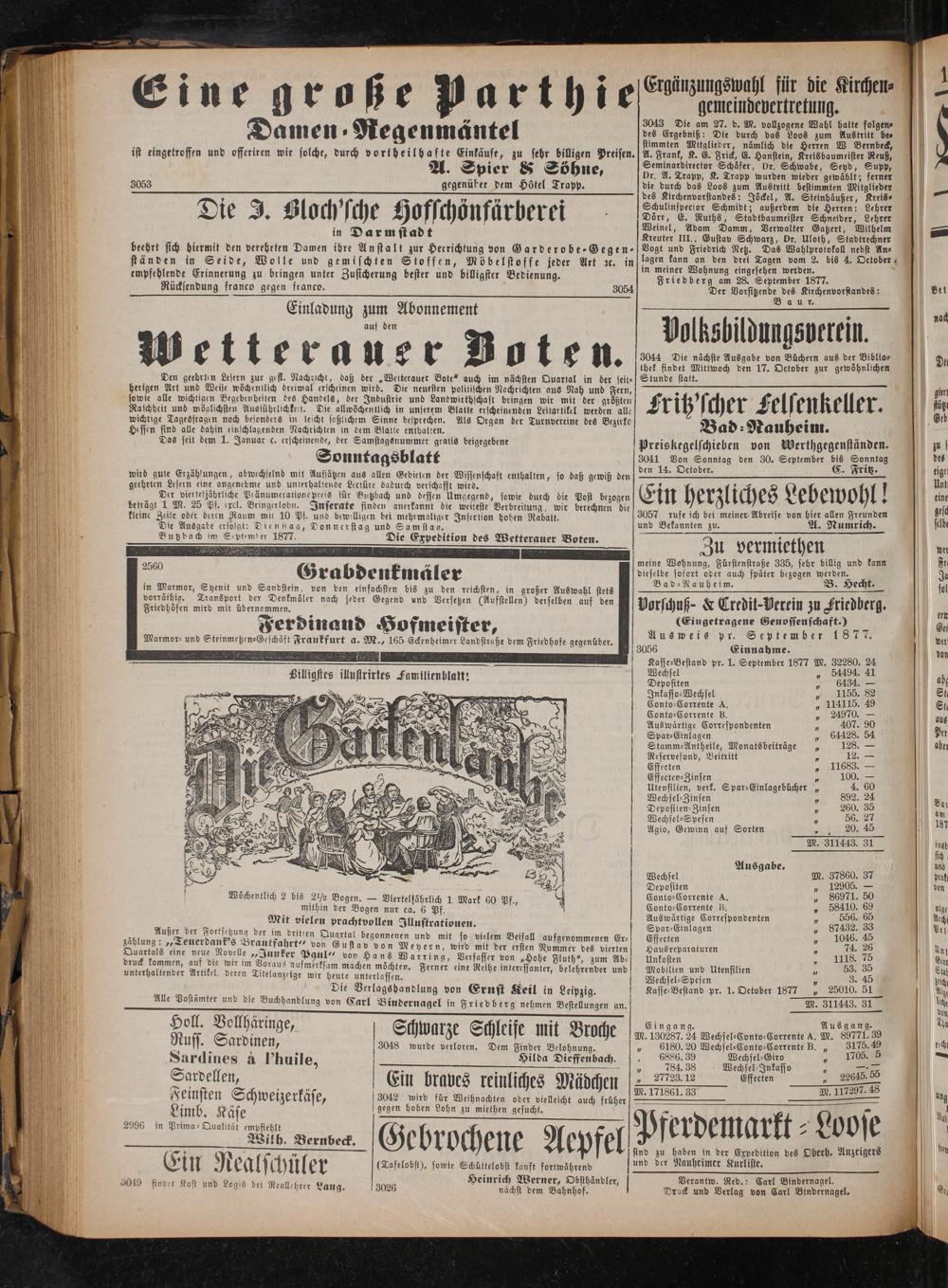 wird gute Erzählungen, abwechselnd mit Aufsätzen aus allen Gebieten der Wissenschaft enthalten, so daß gewiß den geehrten Lesern eine angenebme und unterhaltende Lectüre dadurch verschafft wird. Der vierteljährliche Pränumeratione preis für Butzbach und dessen Umgegend, sowie durch die Post bezogen beträgt 1 M. 25 Pf.(cl. Bringerlobn. Inserate finden anerkannt die weiteste Verbreitung, wir berechnen die kleine Zeile oder deren Raum mii 10 Pf. und bewilligen bei mehrmaliger Insertion hohen Rabatt. Die Ausgabe erfolgt: Dienssag, Don nerstag und Samstaag. Butzbach im Septemper 1877. Die Expedition des Wetterauer Boten.
