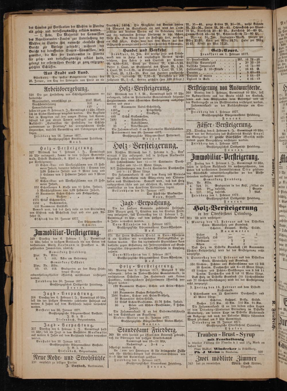 Fässer⸗Versteigerung. 376 Dienstag den 6. Februar d. J. Vormittags 0 Uhr, sollen vor der Bebausung des Gastwirths Adolph Engel am Mainzerthor 17 große Bierfässer öffentlich meist⸗ bietend gegen Baarzahlung versteigert werden. Friedberg den 1. Februar 1877.