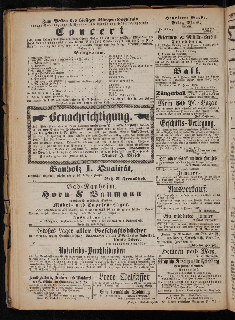 362 Umzugshalber verkaufe meine sämmtlichen Artikel zu Fabrikpreisen. Besonders mache auf eine Parthie Corsetten und Arbeitshemden aufmerksam, welche ich unterm Preis abgebe. Friedberg den 1. Februar 1877.