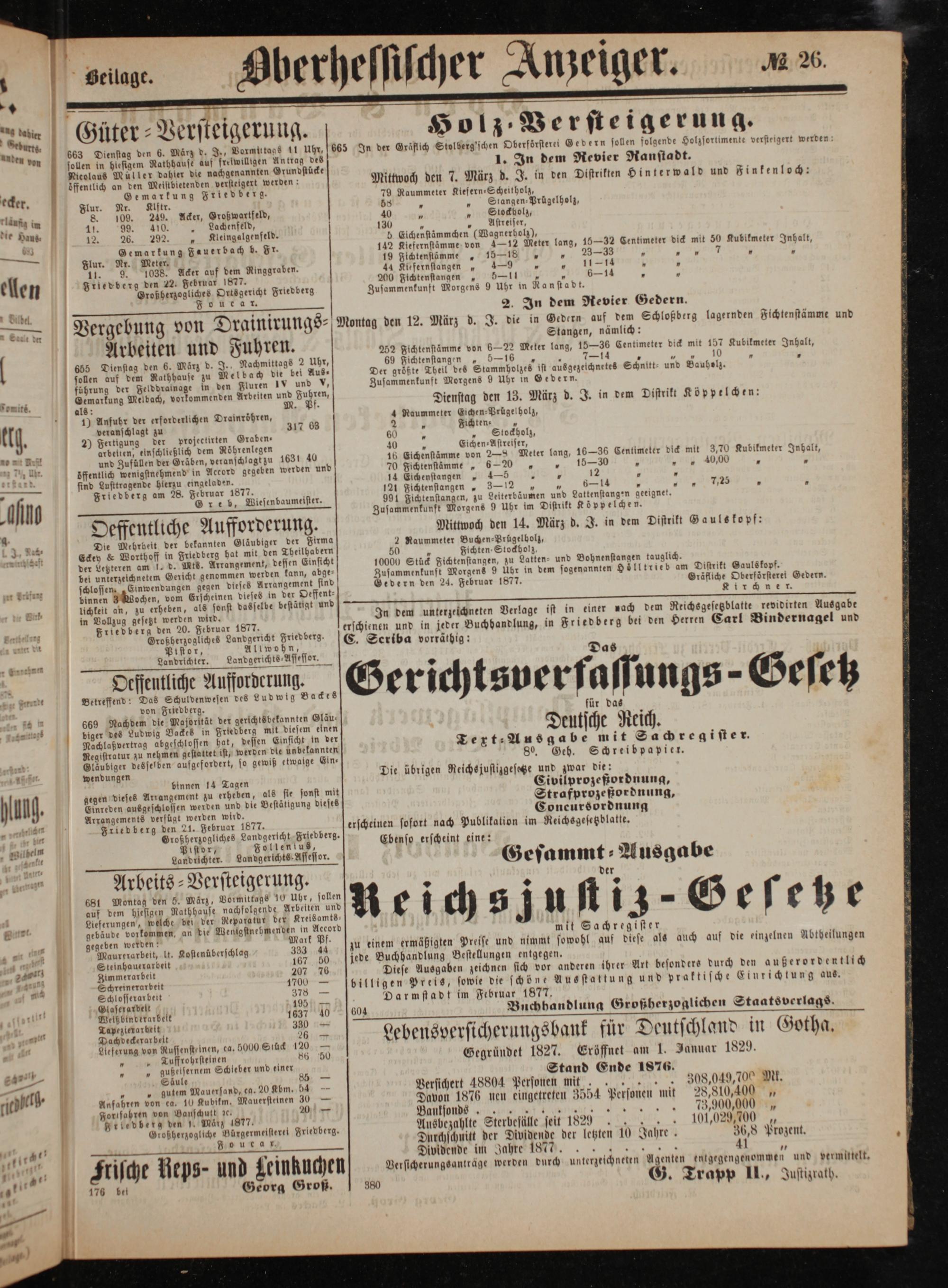 in Vollzug gesetzt werden wird. Friedberg den 20. Februar 1877. Großherzogliches Landgericht Friedberg. Pistor, Allwohn, Landrichter.