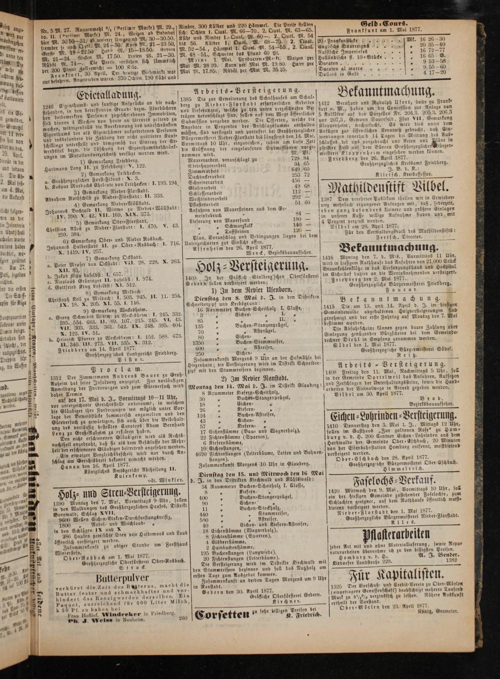 1416 Montag den 7. d. Mis., Vormittags 11 Ubr, wird in hiesigem Rathhause das Anfahren von 21.000 Stück Braunkohlenklötze in das Versorgungshaus und Hospital im Eichelhof dahier an die Wenigstnehmenden versteigert. Friedberg den 2. Mai 1877. Großherzogliche Bürgermeisterei Friedberg. Fouc ar. Bekanntmachung. 1415 Die am 13. und 14. April d. J. im biesigen Gemeindewalde abgehaltenen Holzversteigerungen sind genehmigt und der erste Fahrtag auf Moutag den 7. Mai bestimmt worden. Die Abfuhrscheine können gegen baare Zahlung oder Einlegung genügender Bürgscheine bei dem Gemeinde⸗ rechner Diehl in Empfang genommen werden. Södel den 1. Mai 1877. Großherzogliche Bürgermeisterei Södel. Reiß.