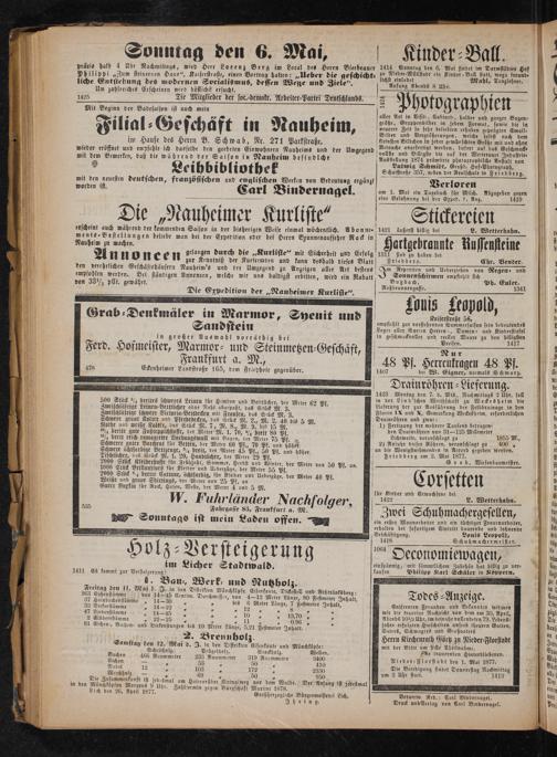 Buch 6 2 5 ele trauernden Hinterbliebenen. 17 486 Raummeter 15 Raummeter 1 Raummeter 100 Nieder⸗Florstadt den 1. Mai 1877. Nadel 12 5 103 2 172 1 2330 5 Die Beerdigung findet Donnerstag Nachmittag Weichholz— 69 5 50 4 950 um 2 uhr statt. 1413