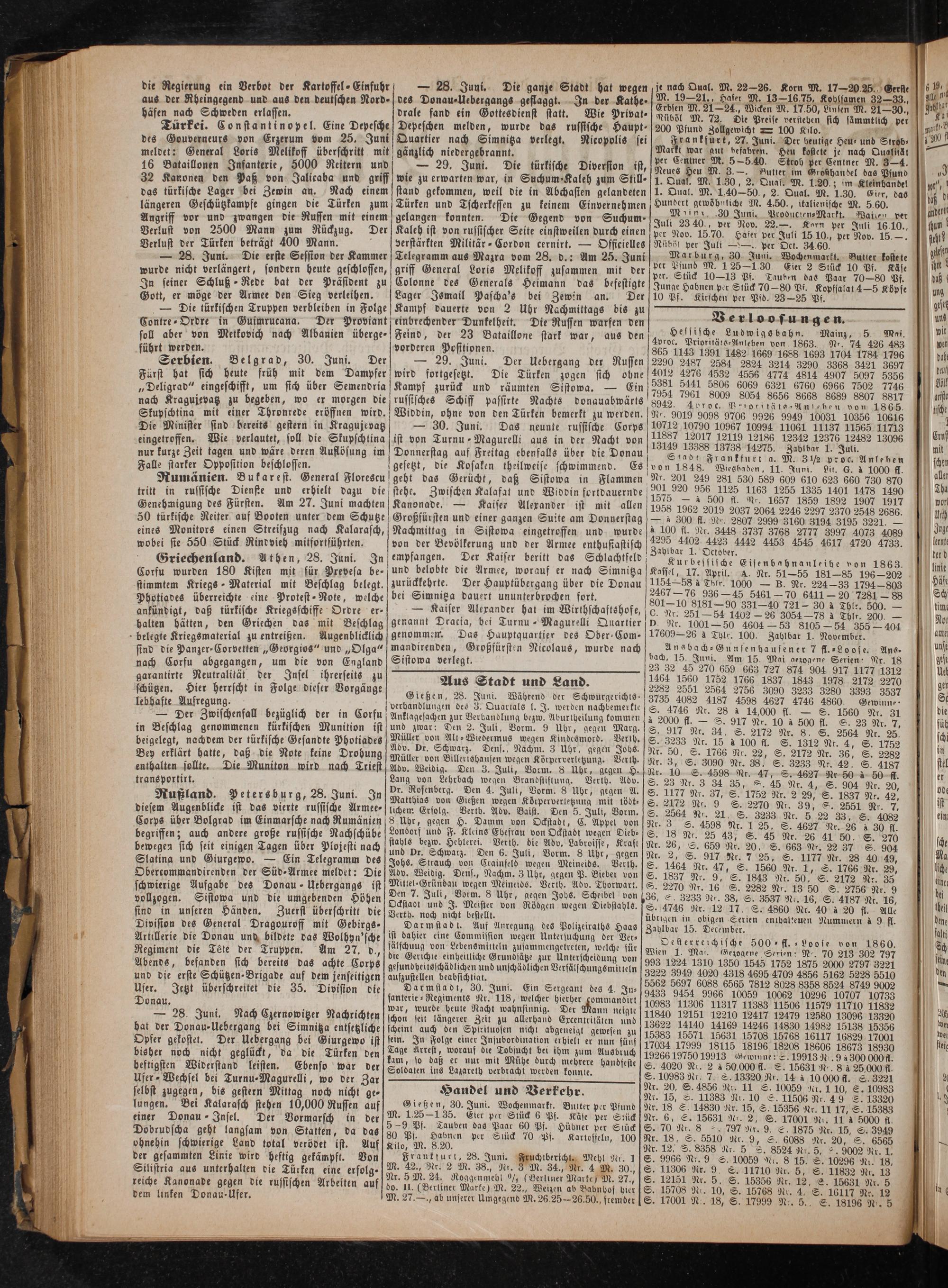 — 29. Juni. Der Uebergang der Russen wird fortgesetzt. Die Türken zogen sich ohne Kampf zurück und räumten Sistowa.— Ein russisches Schiff passirte Nachts donauabwärts Widdin, ohne von den Türken bemerkt zu werden.