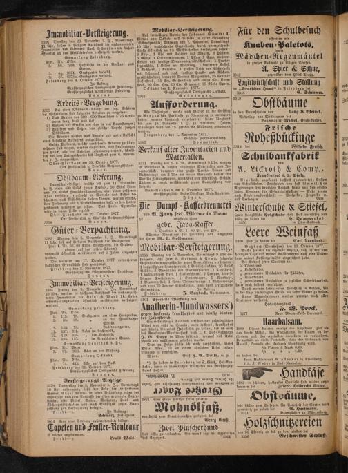 werden. 3366 Montag den 5. November, Vormittags 9 Uhr an⸗ heutigen Tage auf meiner Kalkbrennerei auch eine Nieder⸗ 24 Die weiteren am 17. October 1877 verpachteten fangend, läßt Herr L. Seibert& Comp. folgende lage meines Kohlengeschäfts eingerichtet habe. 1 städtischen Grundstücke sind genehmigt. Gegenstände wegzugshalber gegen Baarzahlung versteigern: Bei Bedars jeder Qualität in: 15 Friedberg den 2. November 1877. 1 doppelsitzigen Comptoirpult, 1 Briefschränkchen, 20 Stück Ia Ofenbrand, 2 Großherzogliche Bürgermeisterei Friedberg. Stühle, 3 Mantelöfen mit Marmorplatten, 1 Tafelherd,„ Kesselkohlen,. Fou car. 1 vollständiges Bett, 1 Kleiderschrank 2 Lampen, diverse„ gewaschenen Nußkohlen für Füllöfen,. 5 7. lederne Treibriemen 15 1 Kinderwagen, 1 Wanduhr,„ Stückkohlen, 4 0 249 Immobiliar⸗Versteigerung. 1 Blumengestel, 1 kleine Dezimalwaage, 1 Küchenwaage„ gewaschenen Nußkohlen zu jeglicher Schmiedearbeit, 1 bir 3384 Freitag den 9 November l. J., Vormittags und eirca 70 Centner Steinkohlen, sowie sonst verschiedene halte mich bestens empfohlen. 900 10 Uhr, r in hießigem Rathhaus die nachnerzeich⸗ Gente. 755 In Auftrag: Durch meinen bedeutenden Verschleiß in Kohlen, hin neten Immobilien der Heinrich Waas II. Erben Friedberg. J. Butzbach, Auectionator. in der Lage die billigsten Preise bei bester Waare zu stellen. 9 Zan erbverthellungshalber öffentlich meistbietend versteigert 2101 Specielle Wirkung des Statine We werden prompt nach allen 1—— werden: 3 ö g* 5. eee Anatherin-Mund wassers) bees, Peg, 4 lur. Nr. Klftr. 1. 1 915 113. 79. Grabgarten am alten Haingraben, gegen lockeres, krankhaftes und häufig bluten 3277 Neue Marmorkalk⸗ Brennez 10 wit „„ N an der Fauerbacher des Jahnfleisch. b Straße, Ein mehrjähriger Gebrauch verschtedener zahnärztlicher aa bal a 0 6 5 118 1 Liebfrauengarten, Mittel war nicht im Stande, mein lockeres, krankhaf es r 8 Ill. 0. 11. 157. 281. Acker im Lachenfeld, und häufig blutendes Zahnfleisch zu heilen, bis ich mich 1989 Dieser Balsam reinigt die Kopfhaut, it als ö 8 P„ 8 g 12. 119. 335.„ der Viehtrieb, 2 Anatherin⸗Mundwassers vom k. k. Hof⸗Zahnarzte das beste Mittel, das Wachsthum der Haare zu be- 4 6 12. 183. 115.„ im Straßheimer Grund. J. G. Popp in Wien bediente, worauf das Uebel fördern und das Ausfallen derselben zu verhindern, Gemarkung Fauerbach b. Fr. schnell und vollkommen gehoben wurde. Er enthält so viele Fettstoffe, dass der Gebrauch von Flur. Nr. Meter. Dem zu Folge fühle ich mich verpflichtet, dieses Haaröl, Pomade ete, dadurch überflüssig wird. FCEiul 5 97. 900. Acker an der Wüstung. Mittel Allen, die an einem ähnlichen Uebel leiden, 1½ Flacon à Mark 0. 60, 4 90 5. 5 dringend zu empfehlen.„ nn 8 R st a dt. Wien. Graf F. A. Bolty, w. p. dazu haben bei 1 0 7. 74. 413. Acker auf dem Bock. 5 Zu haben in Friedberg bei C. Görtz, Hof⸗Apo⸗ P e i.. Ui Friedberg den 31. Oetober 1877. theker, sowie in sämmtlichen Apotheken des Großherzog— C 4 Ns Ortsgericht Friedberg. thums Hessen.* 7 15 N o ue ea r. e 75 7 e 1 F 17 Handkäse a N V 8 aug qun uszuv h une an! 2 daf 3² 5. u i„ ö 3379 Donnerstag den 8. November d. J., Vormittags uszpoc qun usogaezun ueusnoaaunvog gun uus u 3182 in schöner, halbreifer Qualität sind wieder ange 10 Uhr anfangend, läßt der Erbe storbene k W Friedr. Hilbrecht Witwe. yr anfangend, lä er Erbe der verstorbenen 3 ommen be Hilbre ittwe. 1E 105 Samuel Engel Wittwe in deren Behausung neben der a3bUz Soda 43 1 Synagoge noch zum Nachlasse derselben gehörende Gegen⸗ 1 8 4
