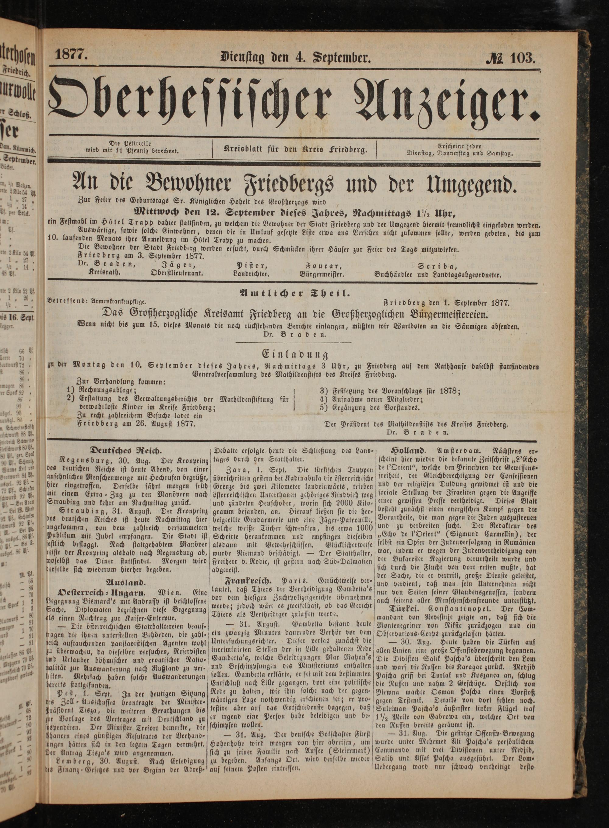 ahl im Hötel Trapp dahier stattfinden, zu welchem die Bewohner der Stadt Friedberg und der Umgegend hiermit freundlichst eingeladen werden. Auswärtige, sowie solche Einwohner, denen die in Umlauf gesetzte Liste etwa aus Versehen nicht zukommen sollte, werden gebeten, bis zum 10. laufenden Monats ihre Anmeldung im Hötel Trapp zu machen. Die Bewohner der Stadt Friedberg werden ersucht, durch Schmücken ihrer Häuser zur Feier des Tags mitzuwirken. Friedberg am 3. September 1877. Dr. Braden, Jäger, Pistor, Foucar, Seri ba,