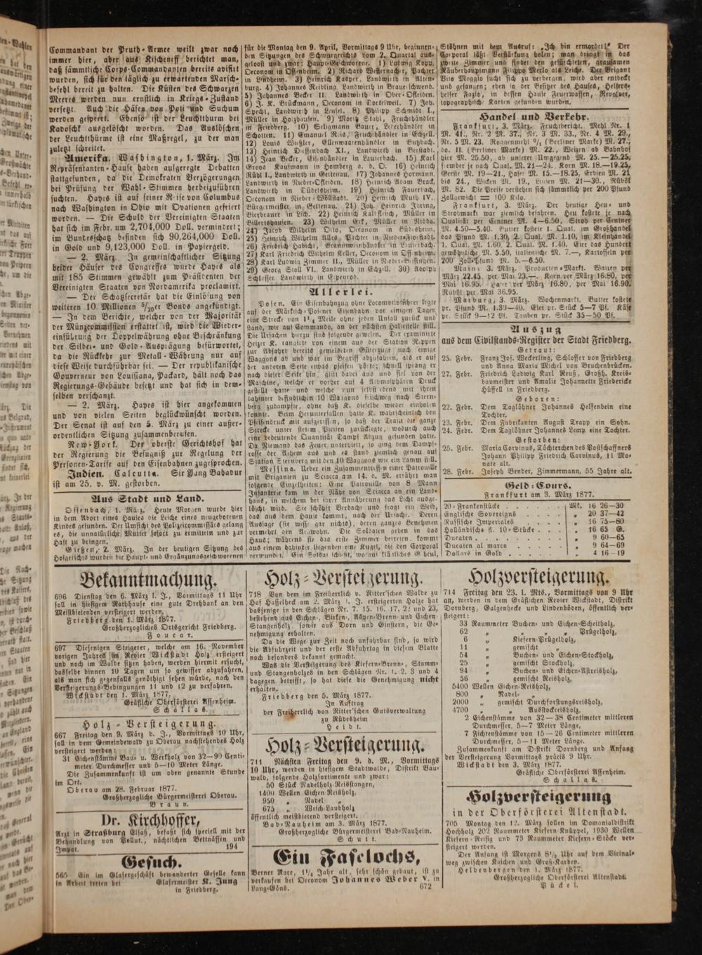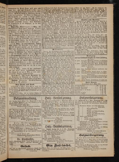 2 Eichenstämme von 32— 38 Centimeter mittleren Durchmesser, 5—7 Meter Länge, 7 Fichtenstaͤmme von 15— 26 Centimeter mittleren Durchmesser, 5— 11 Meter Länge. Zusammenkunft am Distrikt Dornberg und Anfang der Versteigerung Vormittags präeis 9 Uhr. Wickstadt den 3. Marz 1877. Graäfliche Oberfoͤrsterei Assenheim. Schall as.