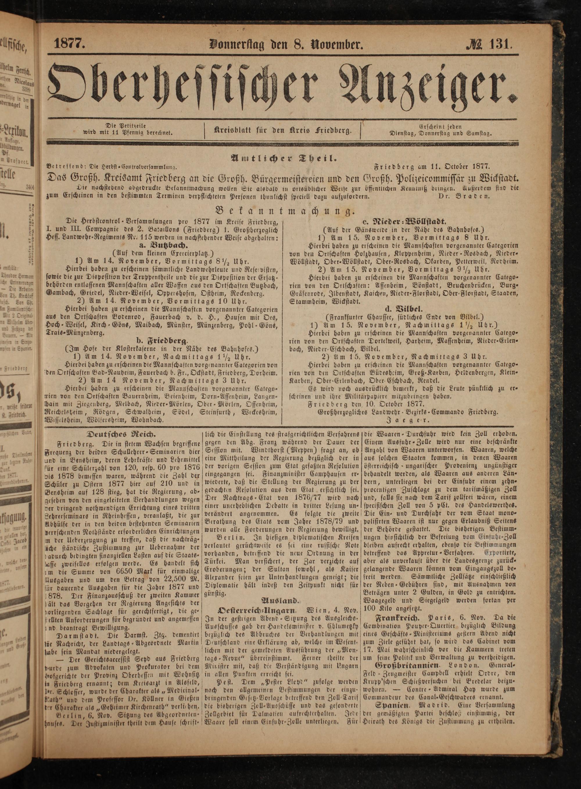 Die Herbstcontrol⸗Versammlungen pro 1877 im Kreise Friedberg, I. und III. Compagnie des 2. Bataillons(Friedberg) 1. Großberzoglich Hess. Landwehr Regiments Nr. 115 werden in nachstehender Weise abgehalten: