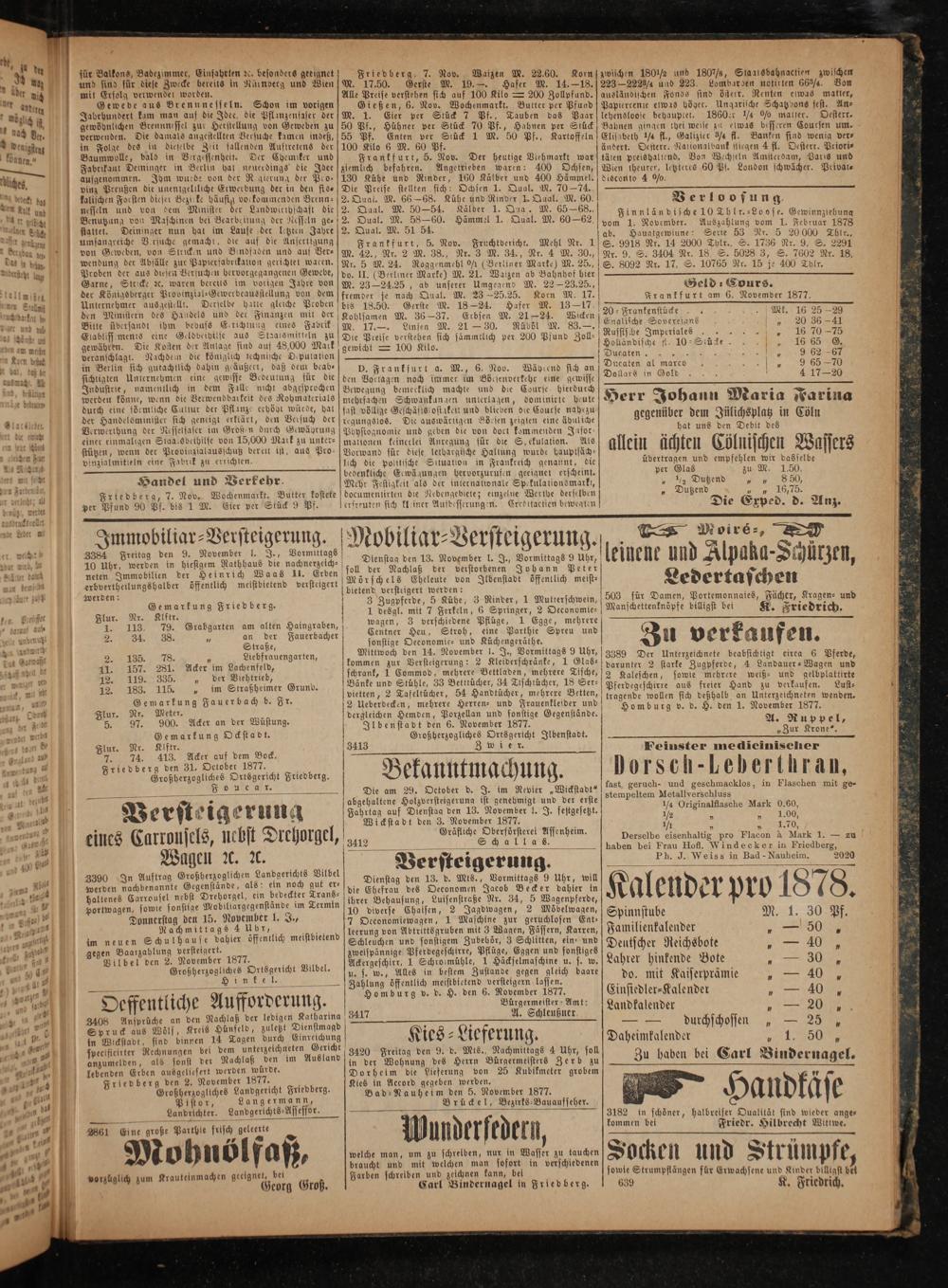Friedberg, 7. Nov. Waizen M. 22.60. Korn M. 17.50. Gerste M. 19.—. Hafer M. 14.—18. Alle Preise verstehen sich auf 100 Kilo= 200 Zollpfund.