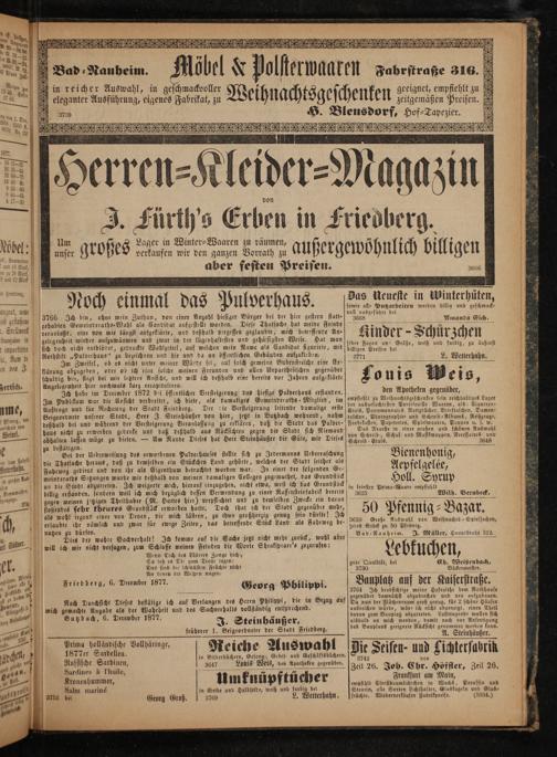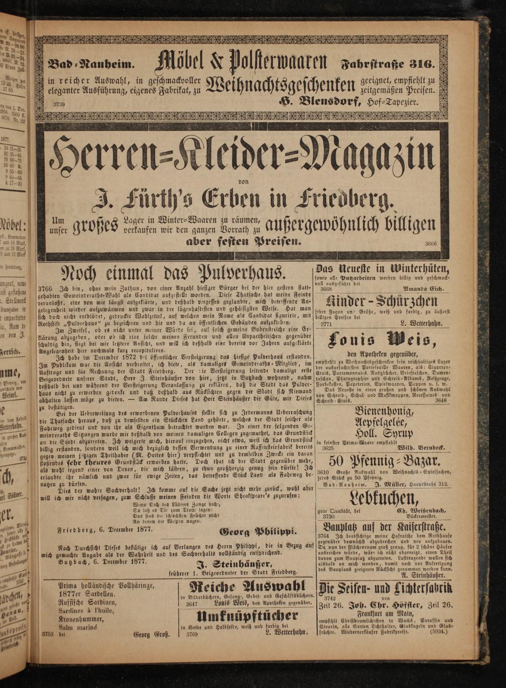 Ich habe im December 1872 bei öffentlicher Versteigerung das hiesige Pulverhaus erstanden. Im Publikum war die Ansicht verbreitet, ich biete, als damaliges Gemeinderaths Mitglied, im Auftrage und für Rechnung der Stadt Friedberg. Der bie Versteigerung leitende damalige erste Beigeordnete unserer Stadt, Herr J. Steinhäußer von hier, jetzt in Butzbach wohnend, nahm deßbalb bei und während der Versteigerung Veranlassung zu erklären, daß die Stadt das Pulver-