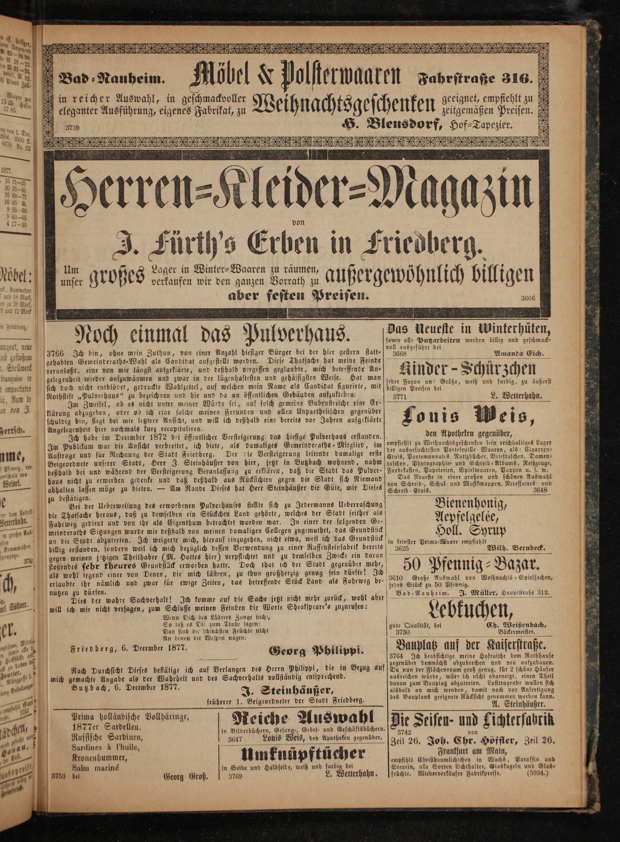 del 0 2* E gelilunf Butzbach, 6. December 1877. J. Steinhäußer, F früherer 1. Beigeordneter der Stadt Friedberg.