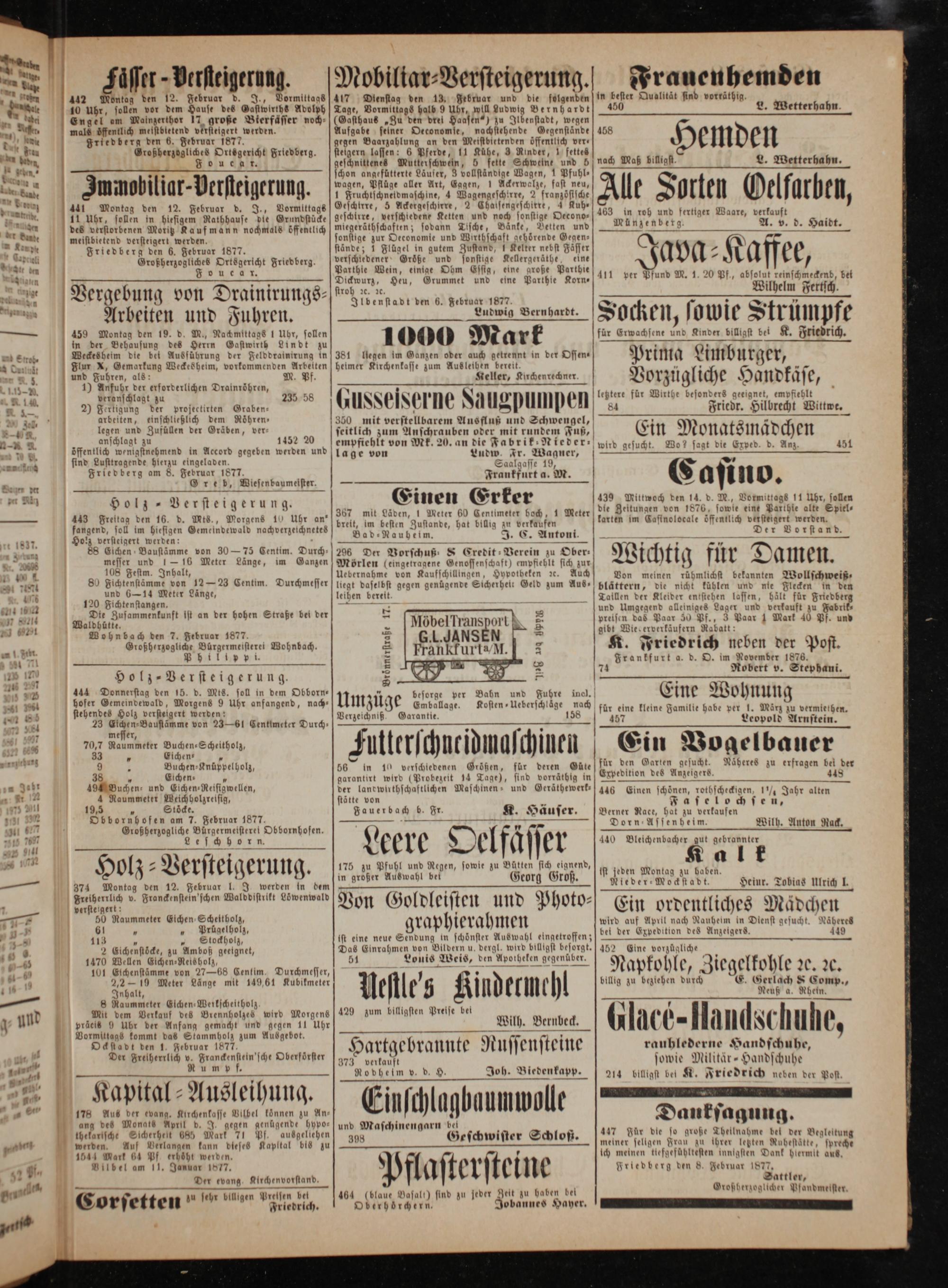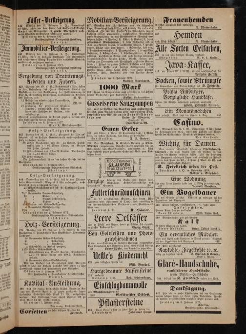 441 Montag den 12. Februar d. J., Vormittags 11 Uhr, sollen in hiesigem Rathhause die Grundstücke des verstorbenen Moriz Kaufmann nochmals öffentlich meistbietend versteigert werden. Friedberg den 6. Februar 1877 Großherzogliches Ortsgericht Friedberg. err.