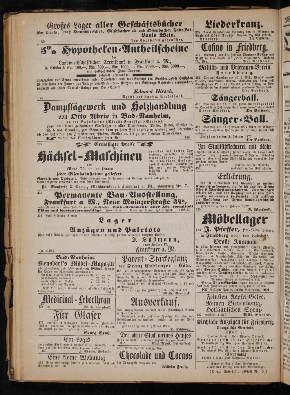 Druck und Verlag von Carl Bindernagel. (Hierzu Unterhaltungsblatt Nr. 6.)