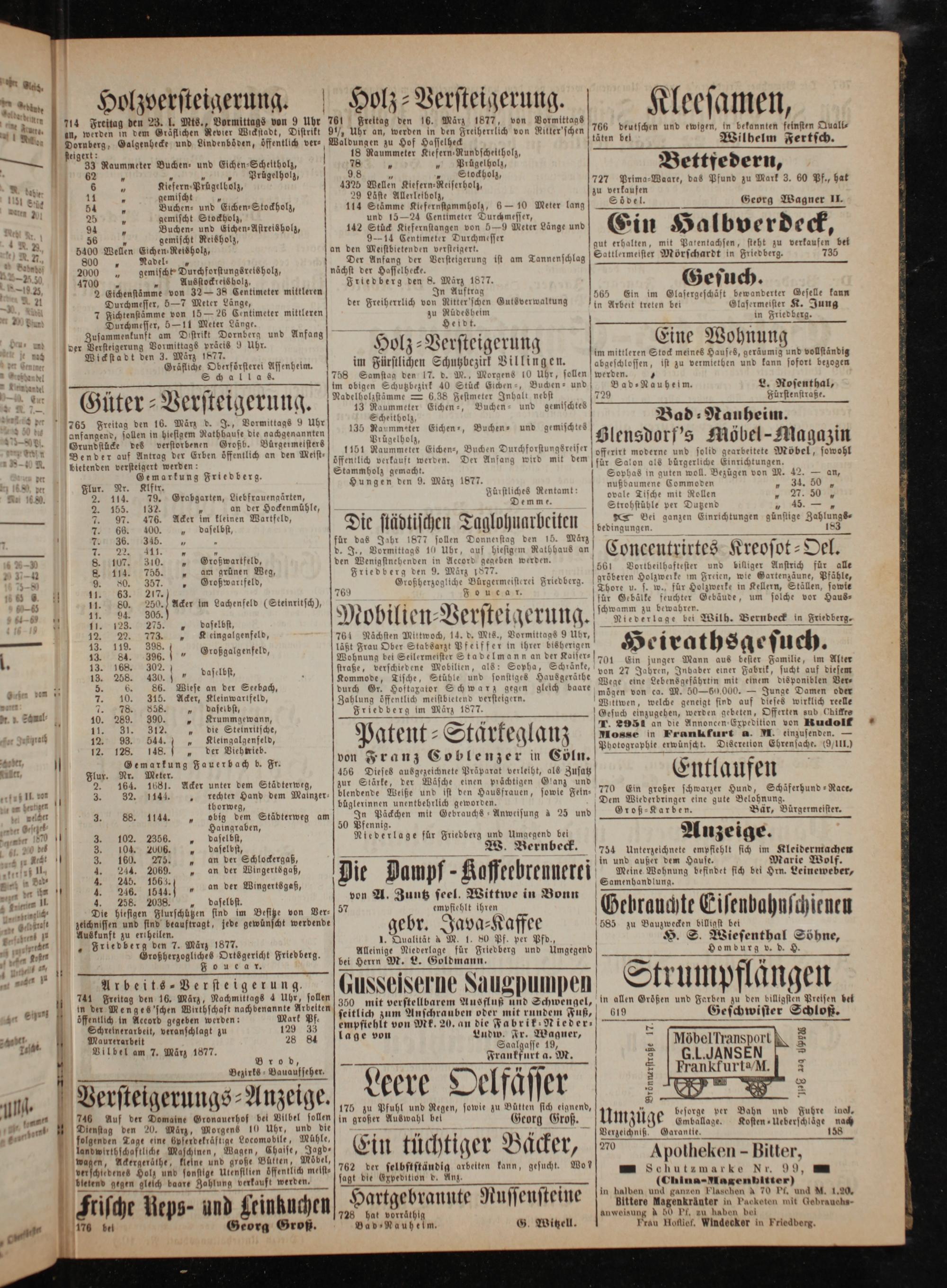 Flur. Nr. Klftr. 3 1 2. 114. 79. Grabgarten, Liebfrauengärten, Fuͤrstliches Rentamt 155. 184 5 an der Hockenmühle, nt 7. 97. 476. Acker im kleinen Wartfeld, Di ati( ei ou, Die städtischen Taglohuarheiten b ens. 345.„ 5 für das Jahr 1877 sollen Donnerstag den 15. März . 7 9 d. J., Vormittags 10 Ubr, auf hiesigem Rathhaus an 8. 107. 310.„ Großwartfeld, den Wenigstnehenden in Accord gegeben werden. A 14. 755.„ am grünen Weg, Friedberg den 9. März 1877. I.„ OGroßwartfeld, Großherzogliche Bürgermeisterei Friedberg. 14 14 39.15 27. 1 769 Foucar. 11. 80. 250.) Acker im Lachenfeld(Steinritsch), 9 5 7 N 3 1 Mobilien Versteigerun 5 H.. 25. daselbst, 0 2 ge g. 1 5 Kseingalgenfeld, 764 Nächsten Mittwoch, 14. d. Mts., Vormittags 9 Uhr, 13. 119. 398. läßt Frau Ober Stabsarzt Pfeiffer in ihrer bisherigen 2 2 1 ld, Bt u 8 5 13. 84. 396.“ Oroßgalgenfe Wohnung bei Seilermeister Stadelmanmsan der Kaiser⸗ 13. 109 302. daselbst straße, verschiedene Mobilien, als: Sopha, Schränke, 13. 258. 430. ö Kommode, Tische, Stühle und sonstiges Hausgeräthe 4 5. 6. 86. Wlese an der Seebach, durch Gr. Hoftaxator Schwarz gegen gleich baare 7. 10. 315. Acker, Kleinwartfeld, Zahlung öffentlich meistbietend versteigern. 4 9 1 5„ A Friedberg im März 1877. 7 289. 1„ rummgewann, 5 6 die Steinxitsche, 8 te ˖ 8 St k 1 1 12. 80. 54.„ Klengelgenseld, atent⸗Starteglanz I.„ der Viehtrieb.* 5 1565 83 9 9* 0 eee n 0 von Franz Coblenzer in Cöln. Flur. Nr. Meter. 456 Dieses ausgezeichnete Präparat verleiht, als Zusatz 2. 164. 1681. Acker unter dem Städterweg, zur Stärke, der Wäsche einen prächtigen Glanz und 3. 32. 1144. rechter Hand dem Mainzer⸗— blendende Weiße und ist den Hausfrauen, sowie Fein— 1 thorweg, büglerinnen unentbehrlich geworden. 3. 88. 1144.„ obig dem Städterweg am In Päckchen mit Gebrauchs Anweisung à 25 und N Halngraben, 50 Pfennig. b 1 102 250.„ daselbst, Niederlage für Friedberg und Umgegend bei 3. 104. 2006.„ daselbst, W. Bernbeck. 1 3. 160. 275.„ an der Schlockergaß, g— 8 5 8 4. 244. 2069.„ an der Wingertsgaß, Die Dampf 2 Koffeebrennerei 1 4 8 1 70„ an der Wingertsgaß, 5 f N 3. 238. 2038. daselbst von A. ZJuntz seel. Wittwe in Bonn Die hiesigen Flurschützen sind im Besitze von Ver⸗ 57 empfiehlt. zeichnissen und sind beauftragt, jede gewünscht werdende gebr. Java⸗K affee Auskunft zu ertheilen. 1 K ö 3 J. Qualität à M. 1. 80 Pf. per Pfd., „Friedberg den 7. März 1877. ige 0 ar grledd Gobezezlich:e Orlsgenicht Friedberg. e, Saen chr. 2. Geld mann.. h en Angegend Foucar. e a 1