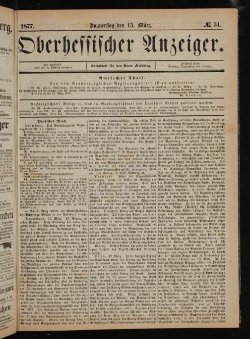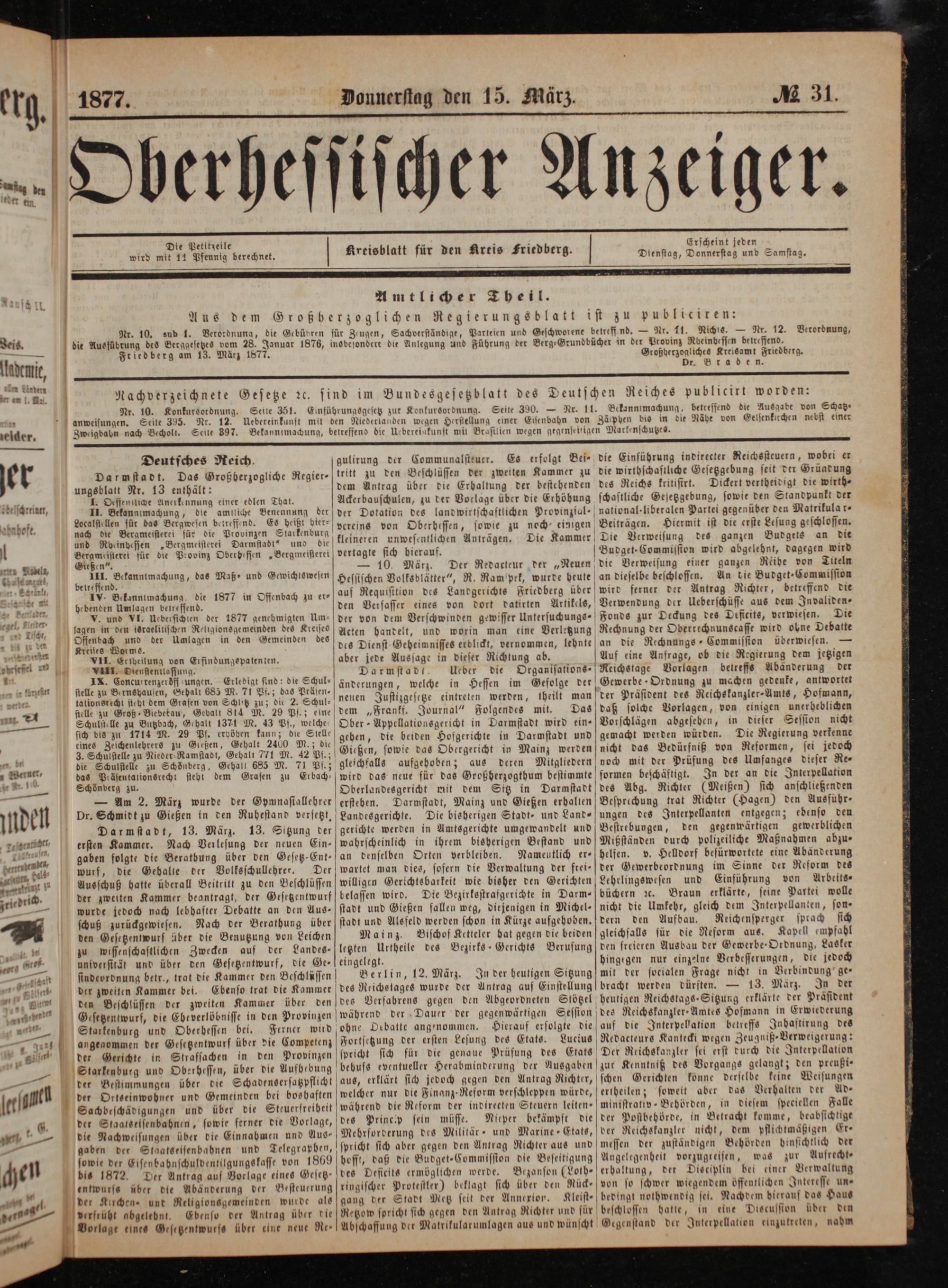 wid de tet em. Die Petitzeile; 1 a a Erscheint jeden j wird mit 11 Pfennig berechnet. Kreisblatt für den Areis Friedberg. Dienstag, Donnerstag und Samstag. .. 10800 11 Amtlicher Theil. Aus dem Großherzoglichen Regierungsblatt ist zu publiciren: 1 Nr. 10. sub 1. Verordnung, die Gebübren für Zeugen, Sachverständige, Parteien und Geschworene betreffend.— Nr. 11. Nichte.— Nr. 12. Verordnung, Leis. die Ausfübrung des Berggesetzes vom 28. Januar 1876, insbesondere die Anlegung und Führung der Berg⸗Grundbücher in der Provinz Rbeinhbessen betreffend. n Friedberg am 13. März 1877. Großberzogliches Kreisamt Friedberg. lladtmie, Dr. Btraden. n leder g 12 a*** 8 f 5 1. un 1. Mul. Rachverzeichnete Gesetze ꝛc. sind im Bundesgesetzblatt des Deutschen Reiches publicirt worden: Nr. 10. Konkursordnung. Seite 351. Einführungsgesetz zur Konkursordnung. Seite 390.— Nr. 11. Bekanntmachung, betreffend die Ausgabe von Schatz⸗ 17 anweisungen. Seite 395. Nr. 12. Uebereinkunft mit den Niedertanden wegen Herstellung einer Eisenbahn von Zälphen bis in die Nähe von Gelsenkirchen nebst einer gelder. Zweigbabn nach Becholt. Seue 397. Bekanntmachung, betreffend die Uebereinkunst mit Brasilien wegen gegenseitigen Markenschutzes. Deutsches Reich. gulirung der Communalsteuer. Es erfolgt Bei- die Einführung indirecter Reichssteuern, wobei er er Darmstadt. Das Großberzogliche Regiet— tritt zu den Beschlüssen der zweiten Kammer zu die wirthschaftliche Gesetzgebung seit der Gründung ungsblatt Nr. 13 enthält: dem Antrag über die Erhaltung der bestehenden des Reichs kritisirt. Dickert vertheidigt die wirth⸗ dellchrti 1. Oeffenuuiche Anerkennung einer edlen That. Ackerbauschulen, zu der Votlage über die Erhöhung schastliche Gesetzgebung, sowie den Standpunkt der ökelschreintt, II. Bekannimachung, die amtliche Benennung der der Dotation des landwirtschaftlichen Provinzial- national- liberalen Partei gegenüber den Matrikula r- lebaboft. ren ee ene von Oberhessen, sowie zu noch einigen Beiträgen. Hiermit ist die erste Lesung geschlossen. und Röeinyessen„Bergmeisterei Darmfabl und die kleineren unwesentlichen Anträgen. Die Kammer Die Verweisung des ganzen Budgets an die