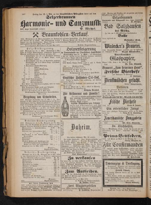1556 Mittwoch den 16. Mai d. J. beginnt der Verkauf neu geformter Kohlenklötze. Der Preis beträgt