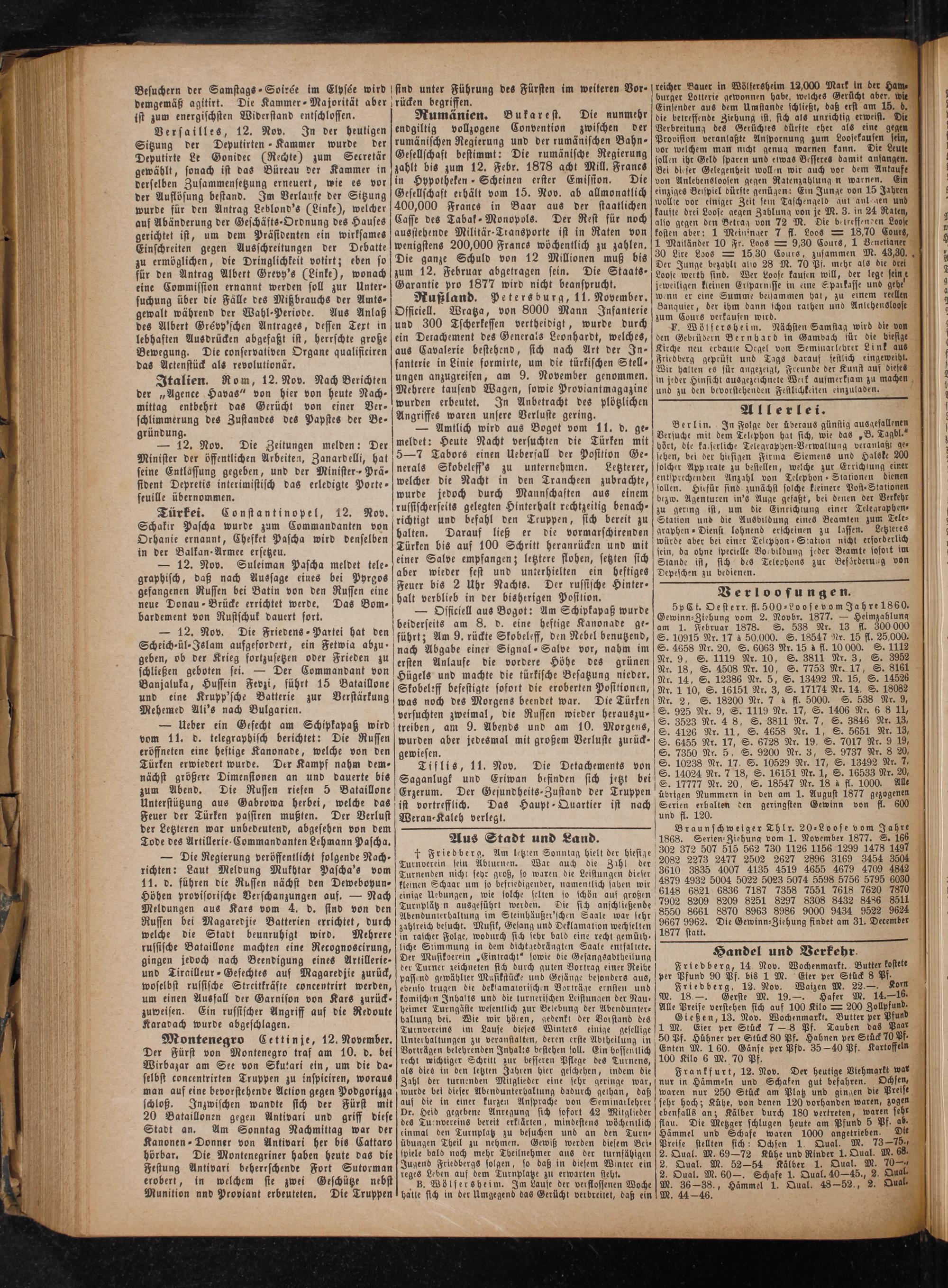 — 12. Nov. Suleiman Pascha meldet tele⸗ graphisch, daß nach Aussage eines bei Pyrgos gefangenen Russen bei Batin von den Russen eine neue Donau ⸗Brücke errichtet werde. Das Bom⸗ bardement von Rustschuk dauert fort.