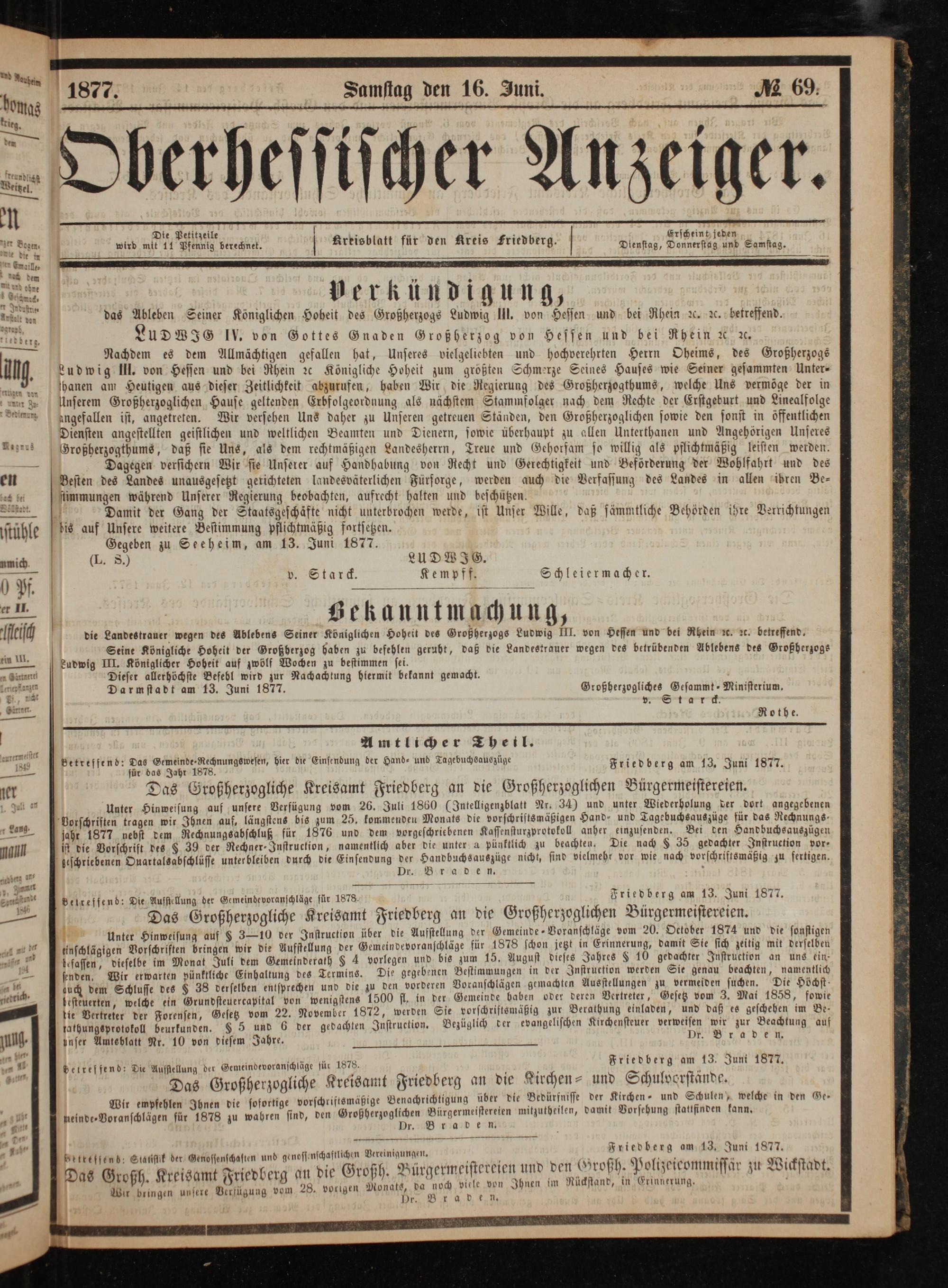 1 Amtlicher Theil. 2 Betreffend: da e e e hier die Einsendung der Hand- und Tagebuchsauszüge Friedberg am 13. Juni 1877. ler Das Großherzogliche Kreisamt Friedberg an die Großherzoglichen Bürgermeistereien.