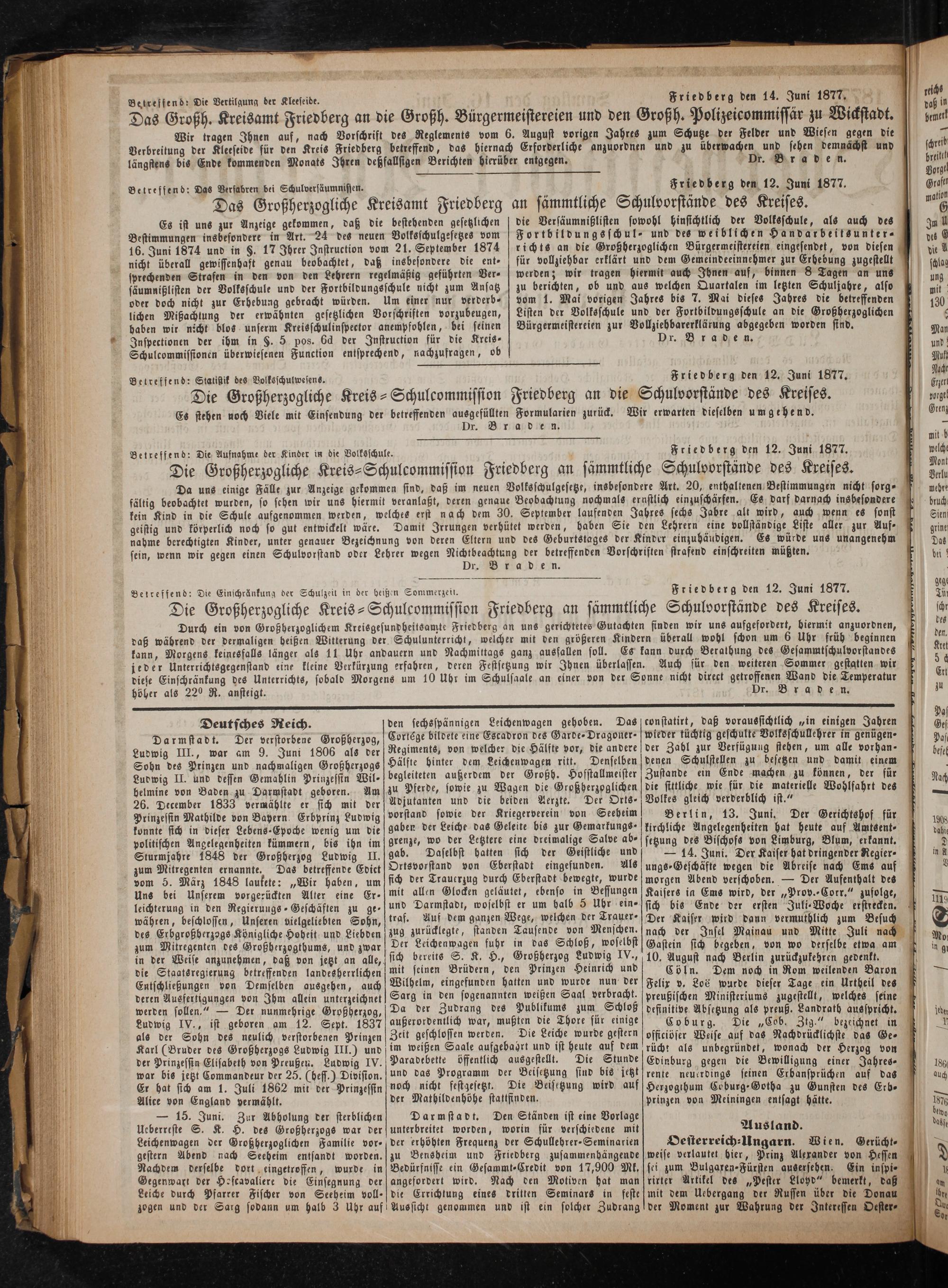 Die Großherzogliche Kreis-Schulcommission Friedberg an sämmtliche Schulvorstände des Kreises. Durch ein von Großherzoglichem Kreisgesundheitsamte Friedberg an uns gerichtetes Gutachten finden wir uns aufgefordert, hiermit anzuordnen, daß während der dermaligen heißen Witterung der Schulunterricht, welcher mit den größeren Kindern überall wohl schon um 6 Uhr früh beginnen kann, Morgens keinesfalls länger als 11 Uhr andauern und Nachmittags ganz ausfallen soll. Es kann durch Berathung des Gesammtschulvorstandes jeder Unterrichtsgegenstand eine kleine Verkürzung erfahren, deren Festsetzung wir Ihnen überlassen. Auch für den weiteren Sommer gestatten wir diese Einschränkung des Unterrichts, sobald Morgens um 10 Uhr im Schulsaale an einer von der Sonne nicht direct getroffenen Wand die Temperatur