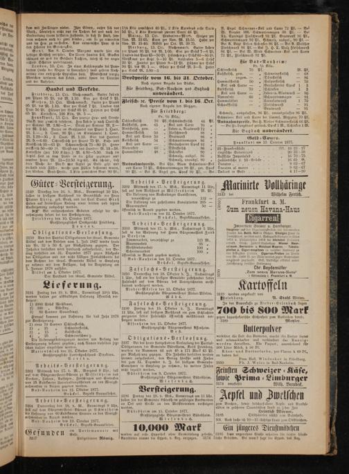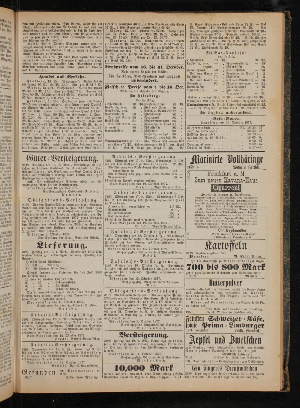 Friedberg, 13. Oct. Wochenmarkt. Butter kostete per Pfund 95 Pf. bis M. 1.10. Eier per Stück 9 Pf.