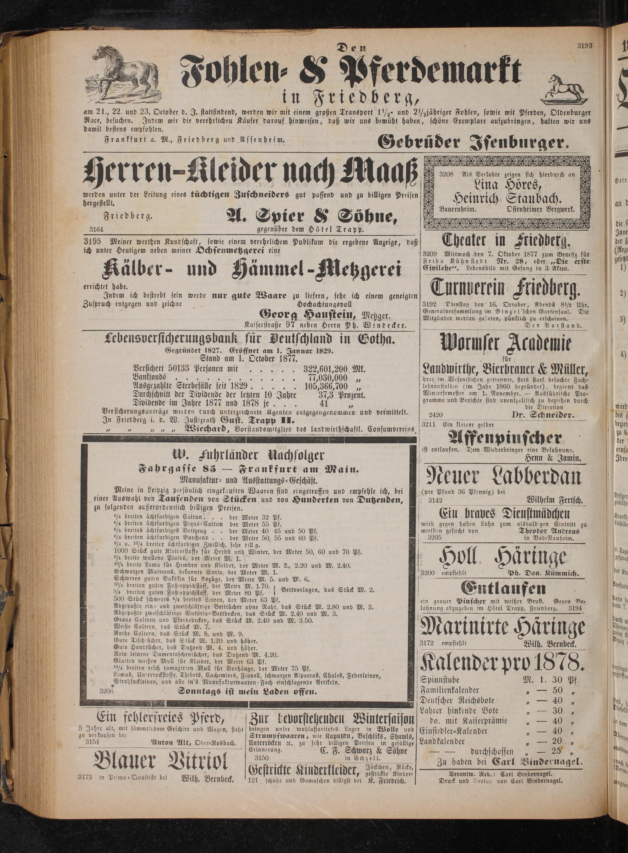 Versicherungsanträge werden durch unterzeichnete Agenten entgegengenommen und vermittelt. In Friedberg i. d. W. Justizrath Gust. Trapp II.