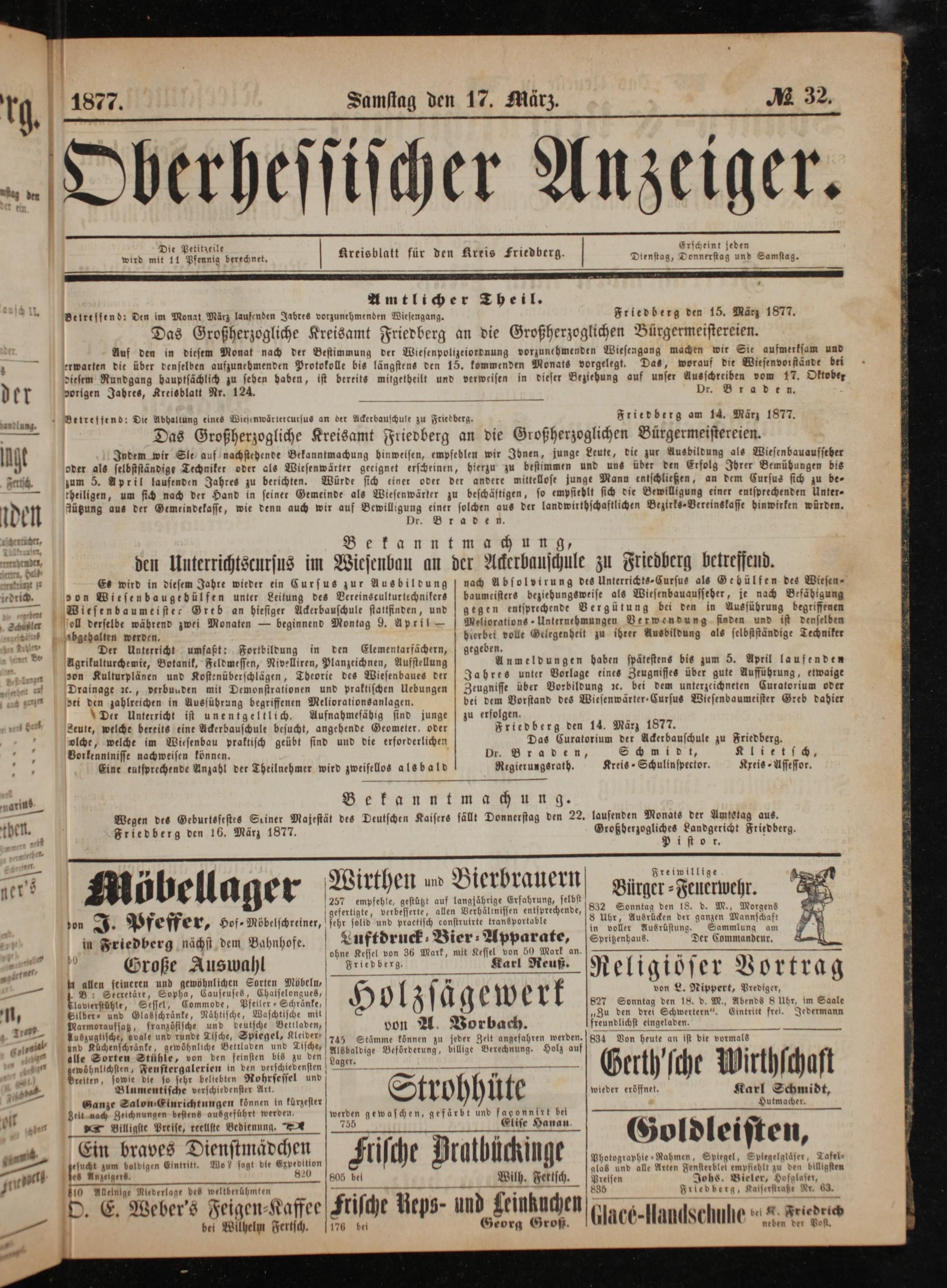 Amtlicher Theil. Belreffend: Den im Monat März laufenden Jabtres vorzunehmenden Wiesengang. Friedberg den 15. März 1877. Das Großherzogliche Kreisamt Friedberg an die Großherzoglichen Bürgermeistereien.