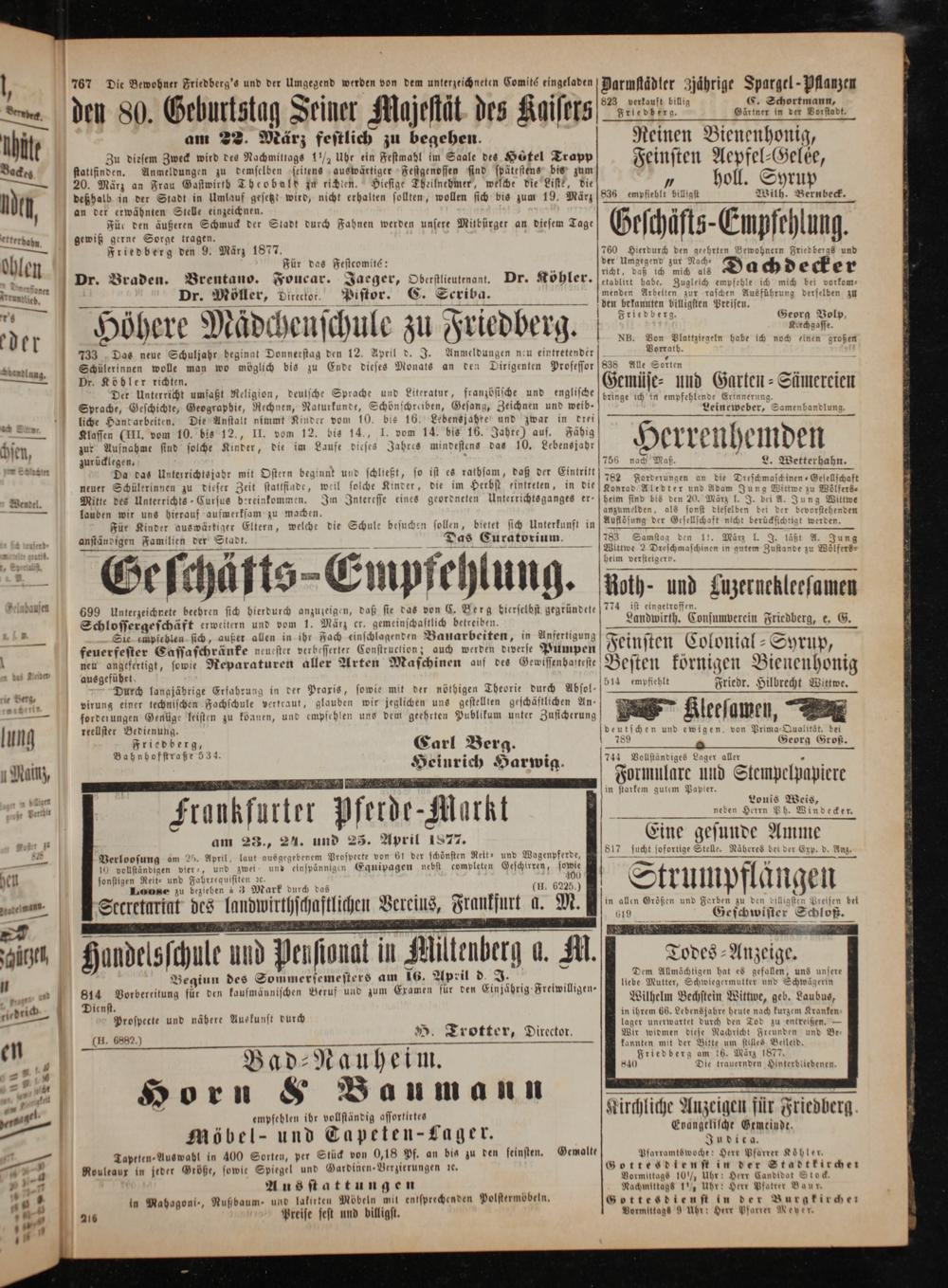 Für nden äußeren Schmuck der Stadt durch Fahnen werden unsere Mitbürger an diesem Tage gewiß gerne Sorge tragen. Friedberg den 9. März 1877.