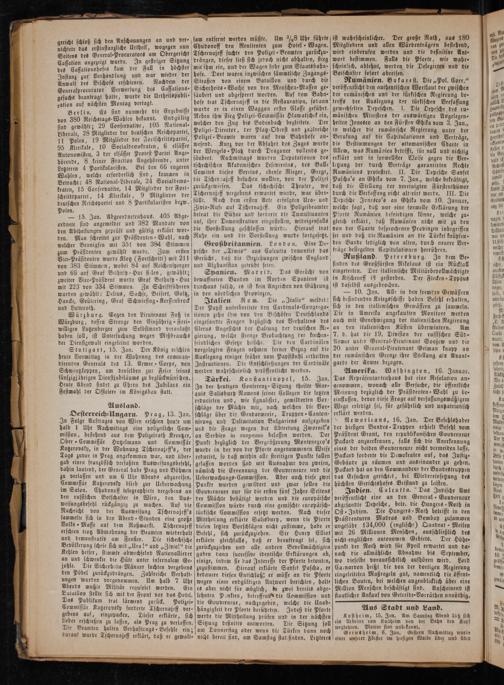 Rumänien. Bukarest. Die„Pol. Corr.“ veröffentlicht den authentischen Wortlaut der zwischen der rumänischen und der türkischen Regierung be— treffs der Auslegung der türkischen Verfassung gewechselten Depeschen. I. Die Depesche des ru— mänischen Ministers der auswärtigen Angelegen⸗ heiten Jonesco an den Fürsten Ghika vom 3. Jan., in welcher die rumänische Regierung unter der Berufung auf die Capitulationen und Verträge, die Bestimmungen der ottomanischen Charte in Allem, was Rumänien betrifft, sür null und nichtig erklärt und in sormellster Weise gegen die Ver— letzung der durch Verträge garantirten Rechte Rumäniens protestirt. II. Die Depesche Savpfet Pascha's an Ghika vom 7. Jan,, welche bekräftigt, daß die Stellung der vereinigten Fürstenthümer durch die Verfassung nicht alterirt werde. III. Die Depesche Jonesco's an Ghika vom 10. Januar, welche sagt, daß nur eine formelle Erklärung der Pforte Rumänien befriedigen könne, welche zu— gleich erklärt, daß Rumänien nicht mit zu den von der Charte besprochenen Provinzen inbegriffen sei und daß die Rumänien an die Türkei knüpfen⸗ den Bande lediglich von alten, durch neuere Ver— träge besiegelten Capitulationen herrühren. Rußland. Petersburg. In dem Be— finden des Großfürsten Nikolaus ist ein Rückfall eingetreten. Der italienische Militärbevollmächtigte in Kischeneff ist gestorben. Der Flecken-Typhus ist daselbst ausgebrochen.