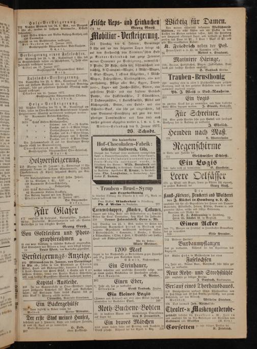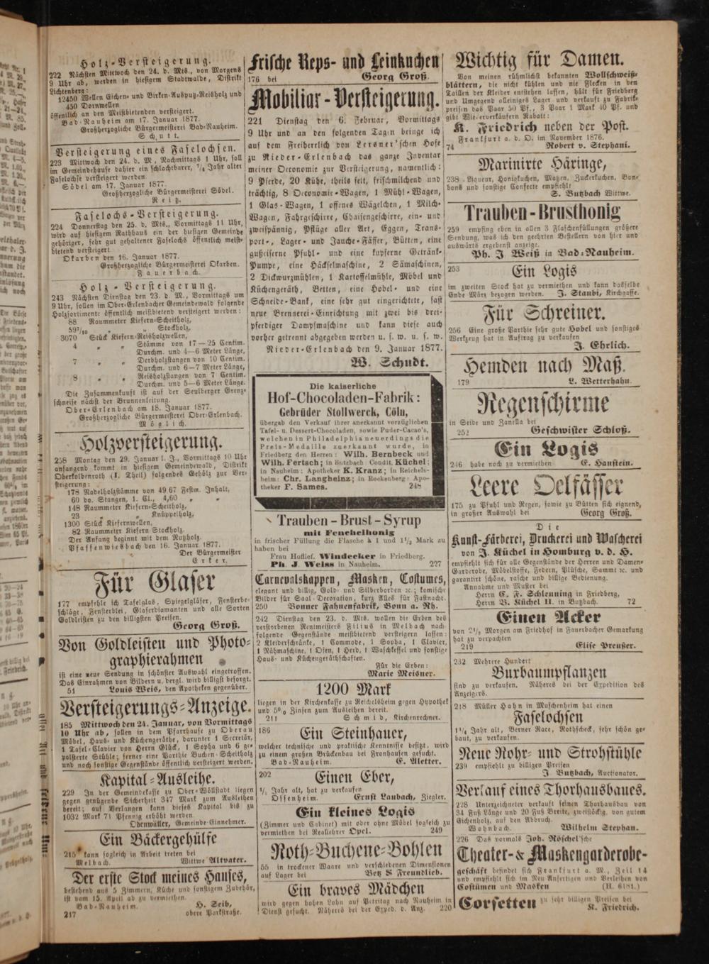 1 Otarben den 16. Januar 18 gußeiserne Pfuhl- und eine kupferne Getränk— „ 1 N 2 0 5 8 r wu ehe Okarben. Pumpe, eine Häckselmaschine, 2 Sämaschinen, 9 9— 1— Hol N st 2 Dicdkwurzmühlen, 1 Kartoffelmühle, Möbel und olz- Versteigerung. 5 b N 223 Nächsten Dienstag den 23. d. M., Vormittags an Küchengeräth, Betten, eine Hobel und eine ö 9 Ubr, sollen im Ober⸗Erlenbacher Gemeindewald folgende Schnelde-Bank, eine sehr gut eingerichtete, fast 1 Holzsortimente Iffentlich meistbietend versteigert werden neue Brennerei-Eir 1 f i 915 0 4 88 Raummeter Kiefern⸗Scheitbol 1 3 ö nicht g mit zwe* drel 1 5980 N Stockbolz⸗ pferdiger Dampfmaschine und kann diese. 4 3070 Stück Kiefern⸗Reisholzwellen, i 1 1 K 4 5 5 Stämme von 17— 25 Centim. vorher getrennt abgegeben werden u. s. w. u. s. w. * Durchm. und 4—6 Meter Lange, Nieder-Erlenbach den 9. Januar 1877. 7 1„ Derbbolzstangen von 10 Centim. 5 5 Durchm. und 6—7 Meter Länge, W. Schudt. 1 8 4„ Reisbolzstangen von 7 Centim.—— 5— Durchm. und 5—6 Meter Länge. „ Die Zusammenkunft ist auf der Seulberger Grenz⸗ Die kaiserliche schneise nächst der Brunnenleit Hof- b, hoe Ole den-F abr ik:. Ober⸗ Erlenbach am 18. 3 1877. Großherzogliche Bürgermeisterei Ober⸗Erlenbach Gebrüder Stolly erck, Cölu, Möglich übergab den Verkauf ihrer anerkannt vorzüglichen 3——— b Tafel- u. Dessert-Chocoladen wie Pud ler-Ca 108, 0 stei. eee — Holzvers E igerung Preis-Medallle zuerkaunt 1 1 238 Montag den 29. Januar l. J., Vormittags 10 Ubr Friedberg den Herren Wilh. Bernbeck uu 2anfangend kommt in diesigem Gemeindewald, Distrikt Wuün. Fertsch; in Butzbach Coudit. Küchel „ Oberkolbenroth(I. Theil) folgendes Gehölz zur Ver⸗ in Nauheim: Apothe eket K.„ iu Bel 2 steigexung: heim: Chr. Langheinz; n R 1. 178 Nadelholzstämme von 49.67 Festm. Inhalt, euer F. Sames. N 1 4 60 do. Stangen, 1. Cl., 4,60 5 1 9 148 Raummeter Kirfern⸗Scheltholz, EU a 28 1„ Knüppelholz, 55 2 1300 Stück Kiefernwellen,* 1 rauben 5 Brust 3 Syrup 1 82 Raummeter Kiefern Stockholz r N 1 Der Anfang beginnt mit 1 Rußholz g mit Fene nel nonig f Pfaffen wies bach den 16. Januar 1877. in frischer Füllung die Flasche à 1 und 1½ Mark zu 1 Der Bürgermeister haben bei i g 1 Er ke r. Frau Hoflief. Windeeker in Friedberg.