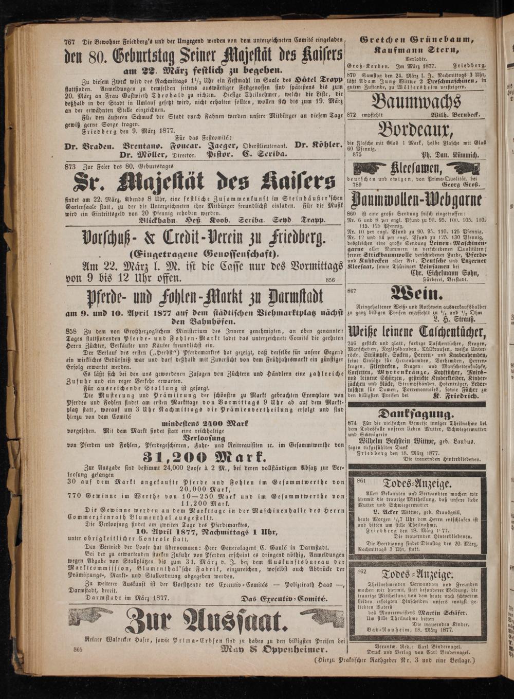 Verantw. Red.: Carl Bindernagel. Druck und Verlag von Carl Bindernagel.