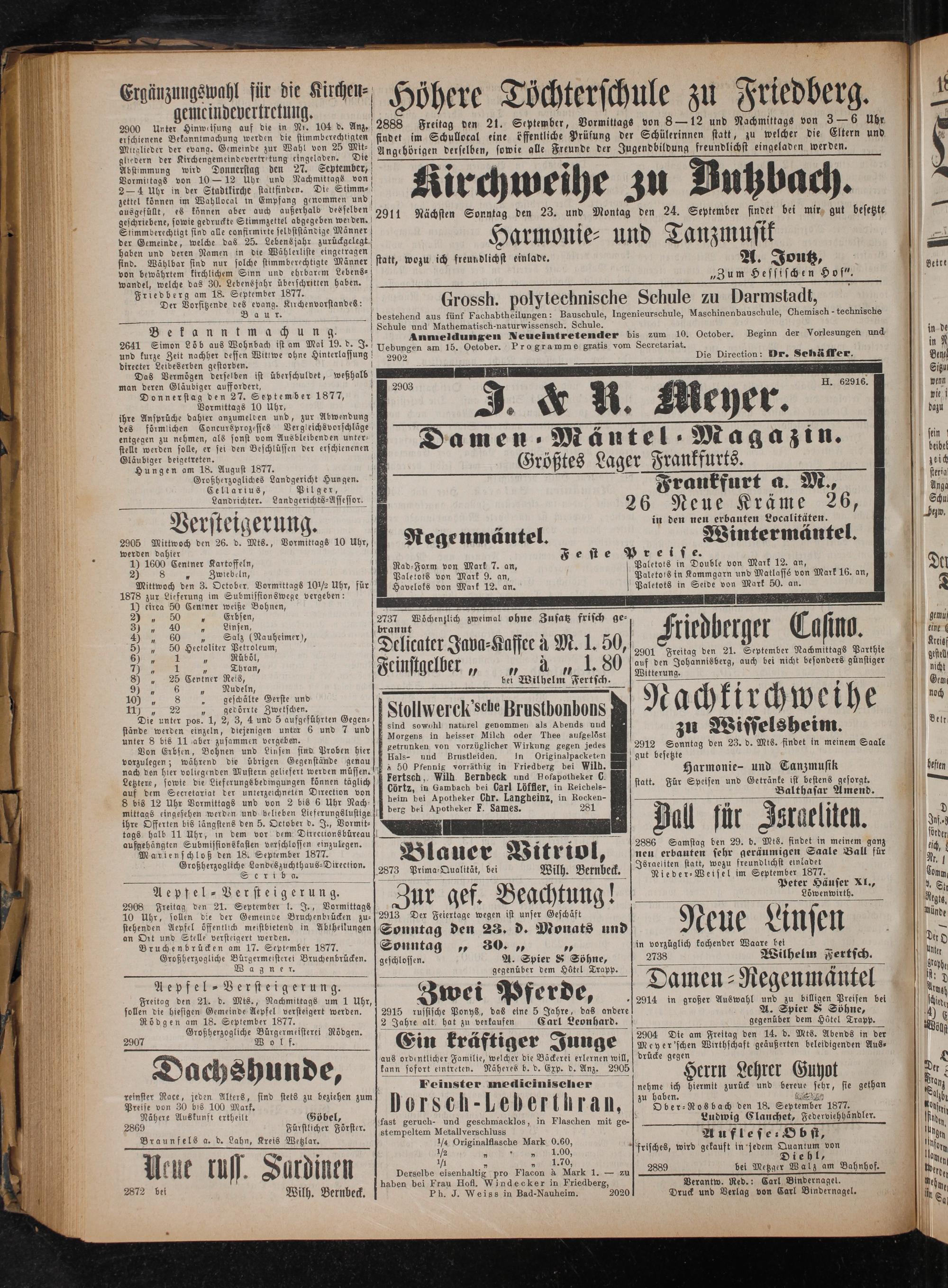 1 FLusen, 2737 Wöchenzlich zweimal ohne Zusatz frisch ge⸗ 7 gemi 2„ 15 1 85 09 0 brannt lied elgkl f III. kine 11„ Salz(Nauheimer), 1 5„ 50 Heelsliter Petreleum, Delicater Java⸗Kaffee à M. 1. 50 9 aul 65,1 5 Rüböl,: 0 72901 Freitag den 21. September Nachmittags Parthie iel 77 1 5 Thran, Feinstgelber a auf den Johannisberg, auch bei nicht besonders günstiger este 8)„ 25 Centner Reis, 1 be Wilh 1 17 tsch Witterung. nicht 10 1 5 1 0 Gert 6 m N F 7 7 1 5 geschälte Gerste un 0 1 wei E 10 u ee ee dee oe, Stollwerck sche Brustbonbons ch 7 2 d 2 erden elke; ien e 1 1 sind sowohl naturel genommen als Abends und 1 Wisselsheim Belt. unter 8 bis 11 aber zusammen vergeben. Morgens in beisser Milch oder Thee aufgelöst 3 5 N Von Erbsen, Bohnen und Linsen sind Proben hier getrunken von vorzüglicher Wirkung gegen jedes 2912 Sonntag den 23. d. Mts. findet in meinem Saale vorzulegen; während die öbrigen Gegenstände genau Hals- und Brustleiden. In Originalpacketen gut besetzte nach den hier voliegenden Mustern geliefert werden müssen.“ e in dern 1 2— 75 Harmonie und Tanzmusik hesten 2 2 2 f 4 8 1 4 2 5— 2 8 e 3 Cörtz, in Gambach bei Carl Löfner. au eien statt. Für Speisen und Getränke ist bestens gesorgt.— ö ö ˖ beim bei Apotheker Chr. Langheinz, in Rocken- Balthasar Amend. 8 bis 12 Uhr Vormittags und von 2 bis 6 Uhr Nach s„ 5 8— mittags eingesehen werden und belieben Lieferungslustige J berg bei Apotheker F. Sames. 281 1 5 d ihre Offerten bis längstens den 5. October d. J., Vormit⸗ JJ. l Ur grade 1 kn Ine 10 5 7 5 vor dem Directions büreau 5———ę— 3 sürder a S.— 5 i i i aten ch leg ben Ad. Se ebe 18. Blauer Witriol, e ebnen sehr gertumigen Saale Bau fn 0 Großherzogliche„ 2873 Prima⸗Qualität bei Wilh Bernbec Israeliten statt, wozu freundlichst einladet 8 !!!... mw ß 8 Nieder⸗Weisel im September 1877. mm Aepfel⸗Versteigerung 3 f. B cht 1 Peter Häuser XI., b. Si i 5 öwenwirth. 4 2908 Freitag den 21. September l. J., Vormittags Ur ge 0 5 ea 0 ung 1 7 1 8 Regt. 10 Uhr, 1 71 die der Gemeinde Bruchenbrücken zu- 2913 Der Feiertage wegen ist unser Geschäft Neu Lin münde t d öffentl i i ban e Sonntag den 28. d. Monats undd Melle En Bruchenbrücken am 17. September 1877. Sonntag„ 30.„. in vorzüglich kochender Waare bei bad Großherzogliche Bürgermeisterei Bruchenbrücken. geschlossen. A. Spier& Söhne, 2738 Wilhelm Fertsch. ie a g n e r. gegenüber dem Hötel Trapp. 2 0 — 1 7 2 7 Aepfel⸗Versteigerung. Zwei Pferde Damen ⸗Regenmäntel lian 18 es den 21. d. Mts., Nachmittags um 1 Uhr,* 9„2914 in großer Auswahl und zu billigen Preisen bei shi so 9 7 hiesigen Gemeinde Aepfel versteigert werden. 2915 russische Ponys, das eine 5 Jahre, das andere A. Spier 8 Söhne, 4 0 ödgen e 1255 e 2 Jahre alt, hat zu verkaufen Carl Leonhard. gegenüber dem Hötel Trapp. Wa rgermeisterei Rödgen. 770000000 f 0 2907 W 5 f. 0 e 2904 Die am Freitag den 14. d. Mts. Abends in der ö Af Ein kräftiger Junge Meyer'schen Wirthschaft geäußerten beleidigenden Aus⸗ aus ordentlicher Familie, welcher die Bäckerei erlernen will, drücke gegen* achs hunde, kenn sofort antreten. Nöherek b. v. Grp. d. Anz. 2905 Herrn Lehrer Guyot Due reinster Race, jeden Alters, sind stets zu beziehen zum e ee nehme ae ee e ee Men Nan ster 2 18, O u haben. e zh Preise von 30 bis 100 Mark. U 0 7 L 0 ö 5. mber e e Gier OTSCh-Leber thran, Ober-Nog bach den 18. September Jer. kann 2869 Fürstlicher Förster fast geruch- und geschmacklos, in Flaschen mit ge- Ludwig Clauchet, Federviehhändler. rde 15 Istempeltem Metall hluss. Braunfels a. d. Lahn, Kreis Wetzlar.. 174 Di e Mark 0.60, 1 0 Au 71 ese Obst, dee i 5 ½ 5 4 005 frisches, wird gekauft in jedem Quantum von om Ucue tufs. Jurdinen e u den 4„ Derselbe eisenhaltig pro Flacon à Mark 1.— zu——— bei Metzger Wal am Bahnhof. werd 0 a 5 haben bei Frau Hofl. Windecker in Friedberg Verantw. Red.: Carl Bindernagel. 0 2872 bei Wilh. Bernbeck. Ph. J. Weiss in Bad-Nauheim. 202⁰ Druck und Verlag von Carl Bindernagel. 1