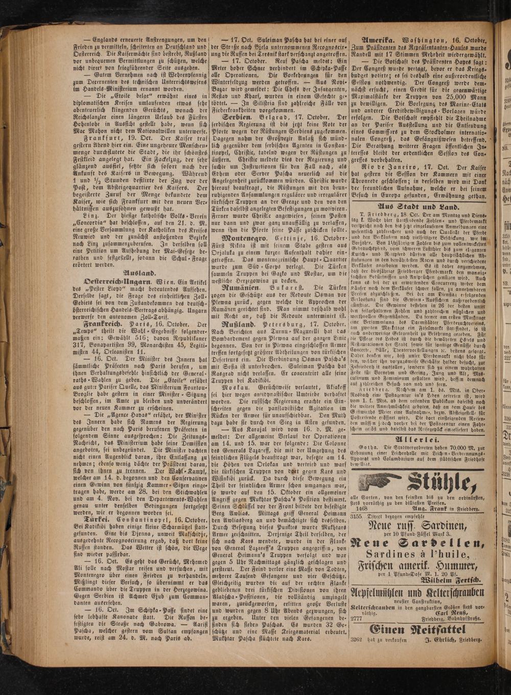 — 17. Oct. Suleiman Pascha hat bei einer auf der Straße nach Bjela unternommenen Recognoscir⸗ ung die Russen bei Tresnik stark verschanzt angetroffen.
