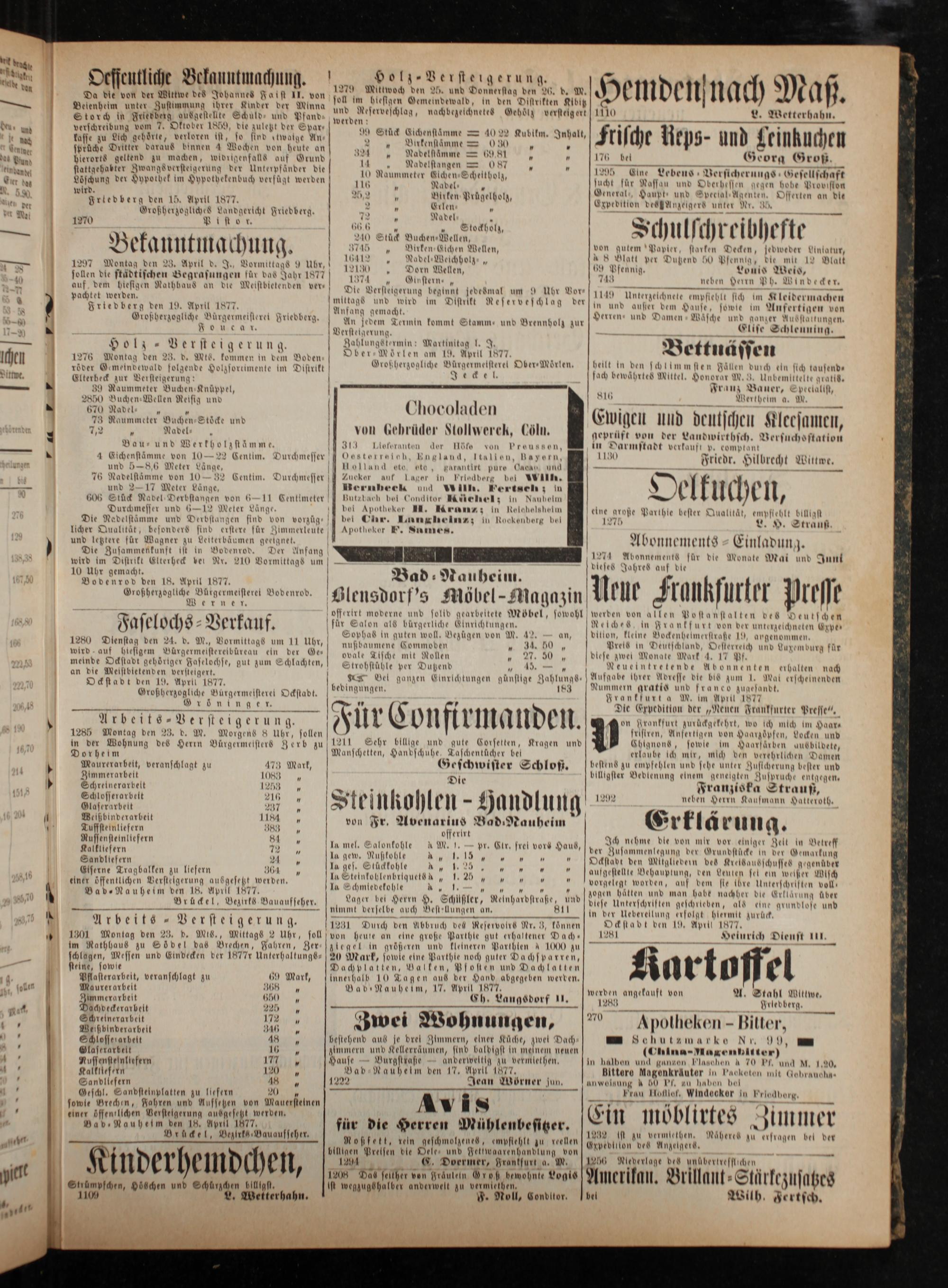 von heute an eine große Parthte gut erhaltener Mach tegel in größeren und kleineren Parthten& 1000 zu 20 Mark, sowle eine Parthle noch guter Pachsparren, Machplatten, Mallen, Pfosten und Dachlatten innerhalb 10 Tagen aus der Hand abgegeben werden. Bab Nauheim, 17. April 1877. Ch., Langsdorf 11.