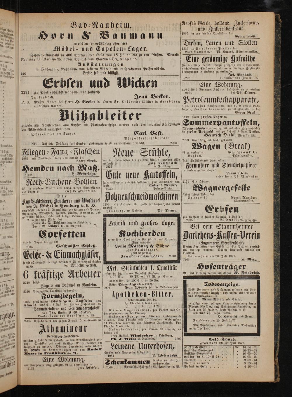 216 Preise fest und billigst. Erbsen und Wicken 2231 zur Saat empfiehlt waggon- und sackweise Lauterbach. Jeau Becker. P. S. Muster können bei Herrn H. Becker bei Herrn Fr. Hilbrecht Wittwe in Friedberg
